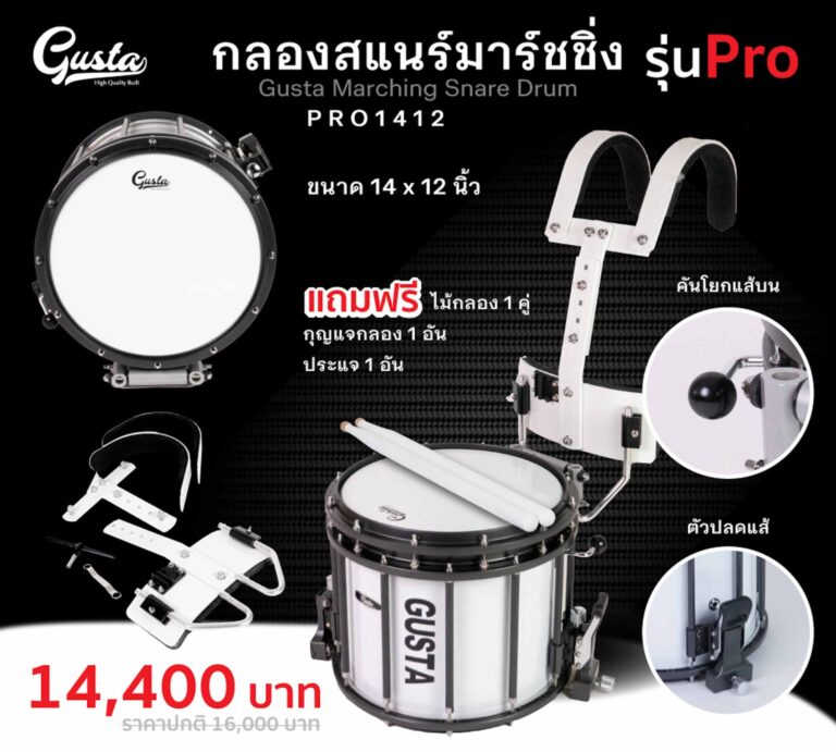 รายละเอียดกลองสแนร์มาร์ชชิ่ง Gusta 14นิ้ว 12หลัก รุ่น PRO1412 Marching Snare Drum พร้อมชุดสะพาย