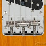 The saddles also feature rounded edges and deeper grooves on 1st and 6th strings, which means much less saddle tilting is required to adjust the string height, and equal string spacing is more easily achieved. Additionally, the saddles are designed with pre-calculated “intonation points” where the string touches the saddle, allowing each string to have and maintain precise intonation. The 10.5mm string spacing allows for easy picking across strings. The saddles themselves are made of titanium for maximum tonal clarity.