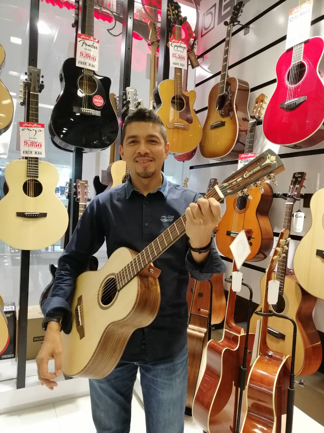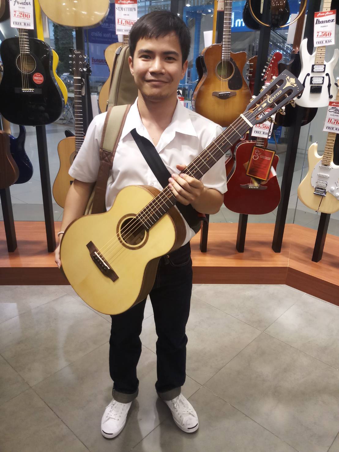 กีต้าร์โปร่งไฟฟ้า Crafter Mino Walnut กีต้าร์ทรง Mino หรือจะมีขนาดเล็กกว่าปกติ เล่นง่าย ไม้หน้าเป็นท็อปโซลิดไม้แองเกิ้ลแมนสปรู๊ซให้คาแรคเตอร์เสียงแหลมดีมาก เสียงจะออกมาพุ่งและคม ชัดเจนทุกตัวโน๊ต เหมาะสำหรับการเล่นฟิงเกอร์สไตล์ ส่วนหลังและด้านข้างใช้ไม้วอลนัท เสียงโทนใส ลายไม้สวย ปิ๊กอัพใช้รุ่น S-1 ออกแอมป์เสียงใสกิ๊งชัดเจน ลูกบิดทรง Deluxe เรียบหรูโออ่าชุบโครเมี่ยมให้อย่างดี ถือเป็นกีต้าร์ที่มีความโดดเด่นเรื่องเสียงใสอย่างมาก และมีความสวยงามเฉพาะตัว
