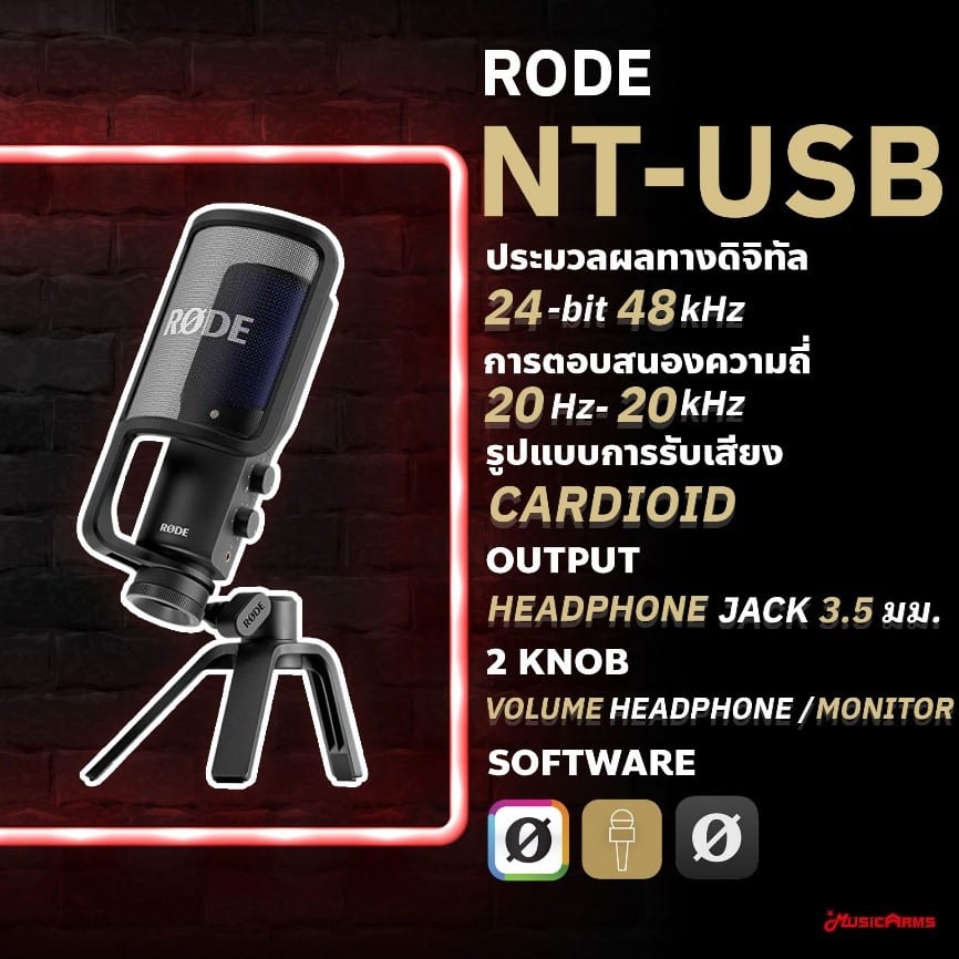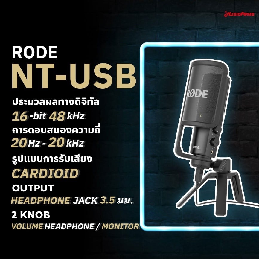 Rode NT-USB ไมโครโฟน USB จาก Rode สัญชาติ Australia ที่ได้รับความนิยมเพราะเป็นไมค์ USB ที่ใช้งานง่าย มาพร้อมกับ Knob หมุ่น 2 Knob พร้อมแจ็ค 3.5 ที่เอาไว้ฟังเสียงเพื่อมอนิเตอร์ทำให้คุณได้ฟังเสียงนั้นก่อนส่งสัญญาณเข้าไปในอุปกรณ์คอมพิวเตอร์หรือแล็ปท็อปของคุณ Rode NT-USB ไมค์ USB ที่มาพร้อมกับ Pop Filter ที่กันลม กันละอองน้ำหลาย และกันซเสียงรบกวนได้เป็นอย่างดี ตอบโจทย์ทั้งงานสตรีมเมอร์เพื่อให้คุณดูเป็นมืออาชีพหรือการทำงานในสตูดิโอก็ไม่แพ้กันเพราะมาพร้อมกับการประมวลผลทางดิจิทัลที่ 16-bit 48kHz ให้การตอบสนองความถี่อยู่ที่ 20Hz – 20kHz การรับเสียง Polar Pattern เป็นแบบ Cardioid รอบรับความดังได้สูงสุด 110 dB SPL Dynamic Range อยู่ที่ 96 dB Rode NT-USB ไมโครโฟน USB ที่ใช้งานได้ตั้งแต่ผู้เริ่มต้นสู่ระดับมืออาชีพ Professional