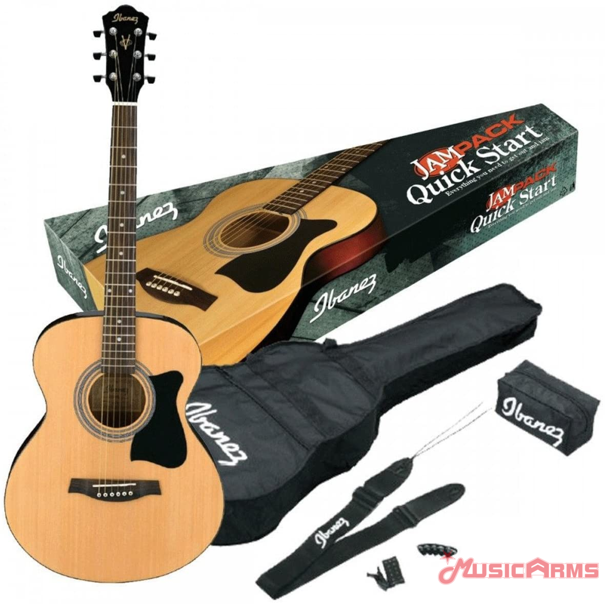The Ibanez VC50 is a full jam pack kit that includes the fantastic Ibanez VC50 acoustic guitar, Gig bag to carry and store your VC50 safely, Clip-Tuner to ensure that your guitar is always in tune, Strap to support the guitar for playing whilst standing, Picks to use to play with and Pouch to store the accessories. The VC50 also comes in a Natural finish.