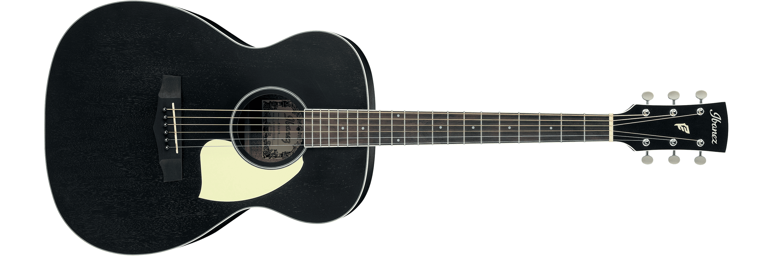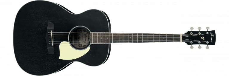 The PC14WK is a grand concert body style acoustic with mahogany top, back and sides which proffers a warm, full tone. While the open pore weathered black finish adds to the guitar’s natural, subtle aesthetics, it also contributes to the sound of the instrument. Thick, heavy finishes can impede the vibration of a guitar’s body, “choking” the instruments tone and projection. The light, carefully applied weathered black open pore finish permits the wood to transfer sound more freely, optimizing vibration and allowing the guitar to realize its full sound potential. The PC14WK also features a chrome open gear tuners, rosewood fretboard and bridge with Ibanez Advantage bridge pins for improved tuning stability.