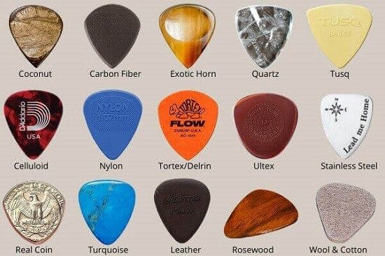ส่วนมากปิ๊กที่เห็นตามท้องตลาดจะทำจากพลาสติก แต่เนื้อพลาสกติกแต่ละประเภทย่อมแตกต่างกันไปทั้งเซลลูลอยด์ ไนล่อน และคาร์บอนไฟเบอร์ ซึ่งรุ่นที่นิยมใช้กันมากทั่วโลกจะเป็นแบบคาร์บอนไฟเบอร์ขนาด 1.0 ของ Dunlop ซึ่งปิ๊กที่ทำจากคาร์บอนไฟเบอร์จะแข็งกว่าพลาสติกชนิดอื่นๆ ทำให้ปิ๊กชนิดนี้เข้ากับแนวเพลงค่อนข้างมากและใช้กับกีต้าร์ไฟฟ้าได้ดี มือกีต้าร์ที่เล่นแนวไฟฟ้าจึงค่อนข้างนิยมเพราะสามารถโซโล่ก็ได้ ตีพาวเวอร์คอร์ดก็แน่น แต่หากเป็นสายกีต้าร์โปร่งจะเน้นแบบปิ๊กไนล่อนที่ให้ความนุ่มนวลของเสียง ข้อเสียของปิ๊กแบบไนล่อนคือเสียงที่ออกมาจะค่อนข้างเบาแต่ให้ความต่อเนื่องของเสียงดี นอกจากนี้ยังมีปิ๊กที่ทำจากวัสดุอื่นๆ เช่น เหล็ก หรือ กระดูก แต่ไม่ค่อยได้รับความนิยมมากนักเพราะแข็งมากจึงทำให้สายกีต้าร์เสื่อมหรือขาดง่าย