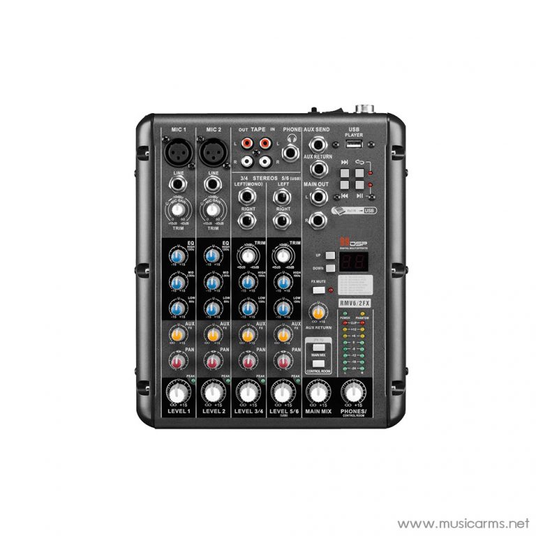 - มิกเซอร์ 6 ช่องสัญญาณ (อินพุตโมโน 2 ช่องและอินพุตสเตอริโอ 2 ช่อง)