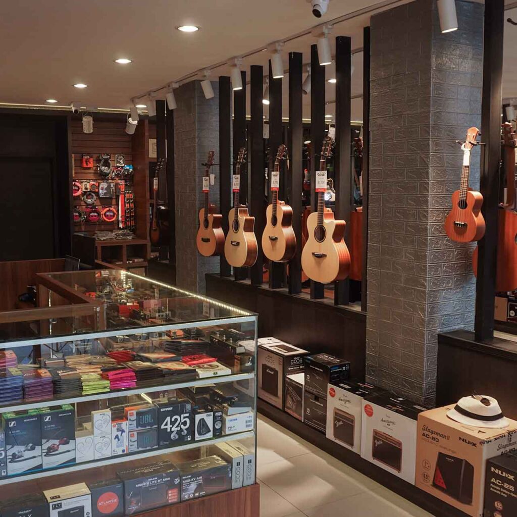 เมื่อเข้ามาในร้านจะพบกับเครื่องดนตรีมากมายให้เลือกสรรพ ไล่ตั้งแต่โซนกีตาร์/เบสที่จะมีกีตาร์โปร่งและไฟฟ้ารวมถึงเบสมากมายให้เพื่อนได้ทดลองเสียงกันเต็มที่ หากสนใจตัวไหนสามารถบอกทีมงานของเราให้หยิบมาลองกันได้เลยนะครับ เรามีกีตาร์แบรนด์ดังมากมายไม่ว่าจะเป็น Gibson, Fender, Ibanez, Yamaha รวมถึงกีตาร์ราคาย่อมเยาเช่น Gusta, Veelah ให้คอยบริการเพื่อนๆ อยากได้สเปคกีตาร์แบบไหน งบประมาณเท่าไหร่ ตรงนี้ทีมงานสามารถให้คำแนะนำกับเพื่อนๆได้ทันที สอบถามได้เลยเพื่อที่ทุกคนจะได้เครื่องดนตรีตามต้องการครับ