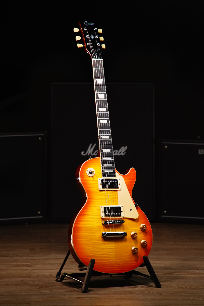 - การผสมผสานของไม้คุณภาพ: บอดี้ทำจากไม้มะฮอกกานี ปะหน้าด้วยไม้เฟรมเมเปิ้ล (Flame Maple) ที่มีลายไม้สวยงามและช่วยเพิ่มมิติเสียง พร้อมด้วยคอไม้มะฮอกกานีและฟิงเกอร์บอร์ดโรสวู้ด ให้โทนเสียงแบบ Les Paul แท้ๆ