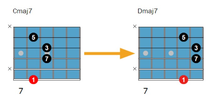 จากตัวอย่างในภาพฟอร์มคอร์ด Major 7 หากเราทำความเข้าใจ Root ได้แล้ว เราก็จะได้คอร์ดอื่นอีกเพียบเลยเพียงแค่เราจับเหมือนเดิม ฟอร์มเดิม แต่เป็นการเลื่อนตำแหน่งเฟรต เราก็จะได้คอร์ดใหม่แล้ว