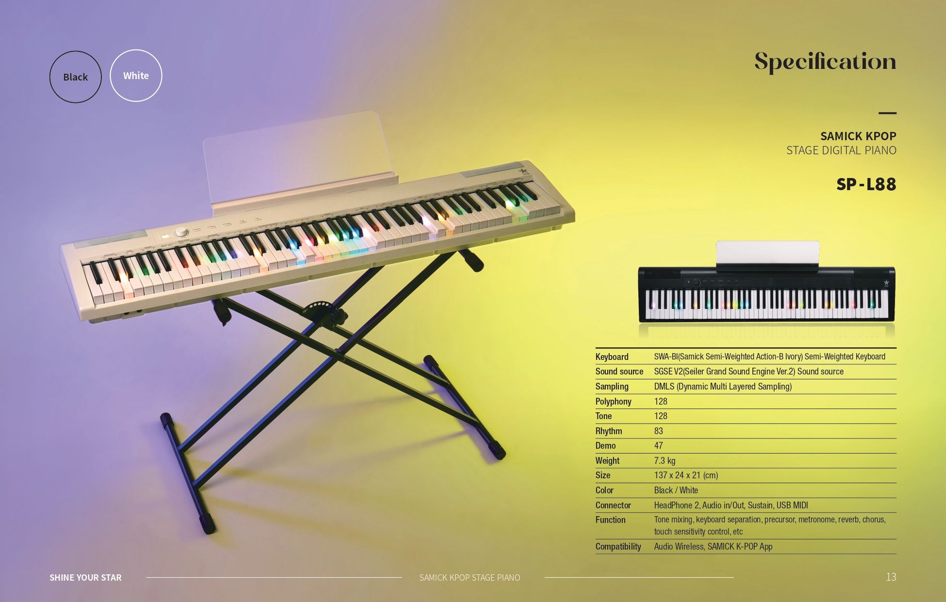 Samick SP-L88 นำเสนอวิธีการใหม่ในการเล่นเปียโนดิจิตอลแบบพกพา ด้วยรูปลักษณ์ที่สวยงามและประสิทธิภาพที่ยอดเยี่ยม มาพร้อมกับคีย์บอร์ดระดับมืออาชีพและแถบไฟส่องสว่าง