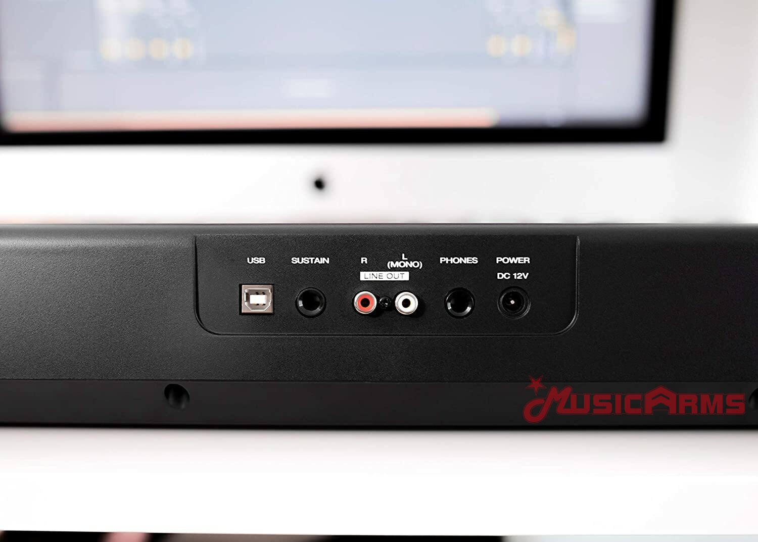 In addition to the ¼” (6.35mm) sustain pedal input (pedal not included) and the ¼” (6.35mm) stereo headphone output, Recital also features stereo RCA outputs to connect to a recorder, mixer, amplifier or other sound system. Recital also features a USB-MIDI output for connecting to a computer and using educational software or virtual instrument plugins. Recital can be powered using the included power supply or by 6 D Cell batteries (not included).