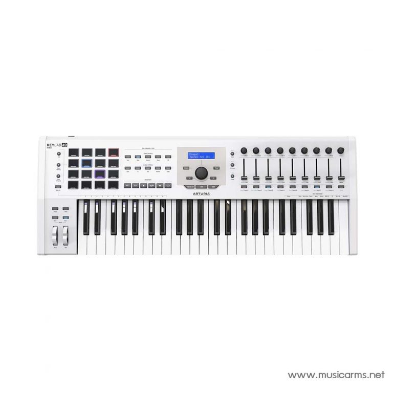 Arturia KeyLab 49 mkII MIDI Controller รุ่นเรือธงของ Arturia การเชื่อมต่อ USB และ MIDI, 49 ปุ่มที่ตอบสนองสูง, แชสซีอลูมิเนียมและการรวม DAW ที่ลื่นไหล Arturia ได้ติดตั้ง MkII ด้วยจำนวนแผ่นประสิทธิภาพเพิ่มขึ้นสองเท่า (ปัจจุบันคือ 16 ชิ้น) ซึ่งช่วยให้คุณสานจังหวะที่สลับซับซ้อนยิ่งขึ้นและใช้ประโยชน์จากตัวอย่างในแทร็กของคุณได้ดียิ่งขึ้น การควบคุมการขนส่งได้รับการอัปเดตเพื่อให้สามารถควบคุม DAW ที่คุณเลือกได้ดียิ่งขึ้น รวมถึงการควบคุมโซโล/การปิดเสียง บันทึก เพิ่มเครื่องหมาย และอื่นๆ อีกมากมาย