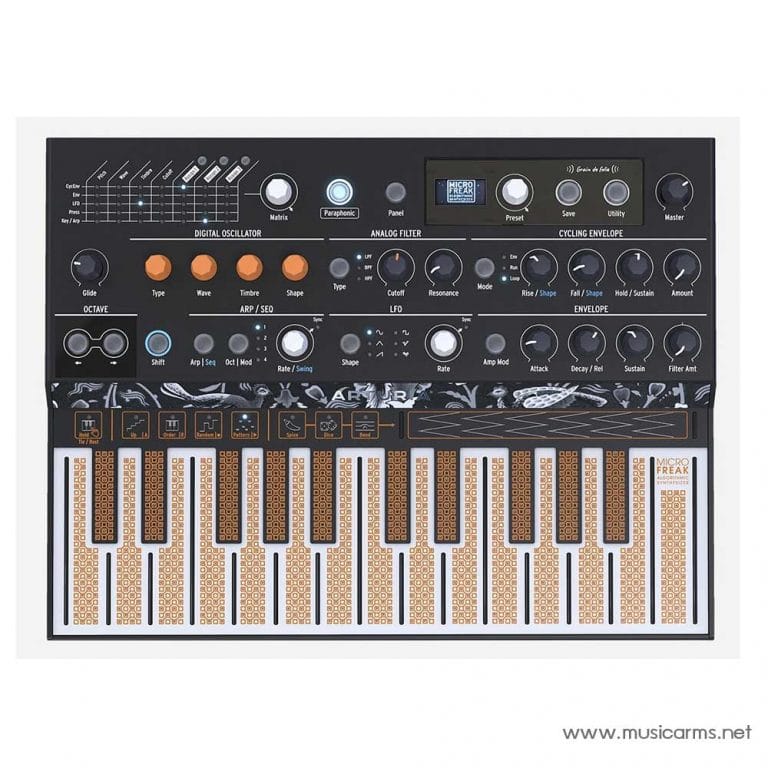 Arturia MicroFreak ซินธิไซเซอร์ 25 คีย์แบบไฮบริดที่มีราคาย่อมเยาที่มีออสซิลเลเตอร์แบบเวฟและดิจิตอล ฟิลเตอร์อะนาล็อก เมทริกซ์มอดูเลต แผงสัมผัสที่แปลกใหม่แต่ถ่ายทอดอารมณ์ได้ดี มีโหมดต่างๆ ที่เป็นเอกลักษณ์ เช่น Texturer, KarplusStrong, Harmonic OSC และ Superwave, Arturia ร่วมมือกับ Mutable Instruments ผู้ผลิต Eurorack ที่มีชื่อเสียงเพื่อรวม Plaits wavetable oscillator ที่ได้รับการยกย่องเข้ากับเสียงประสาน 4 เสียงที่เพิ่มเข้ามา เป็นเครื่องมือในอุดมคติในการสร้างประเภทเสียงใหม่ทั้งหมด