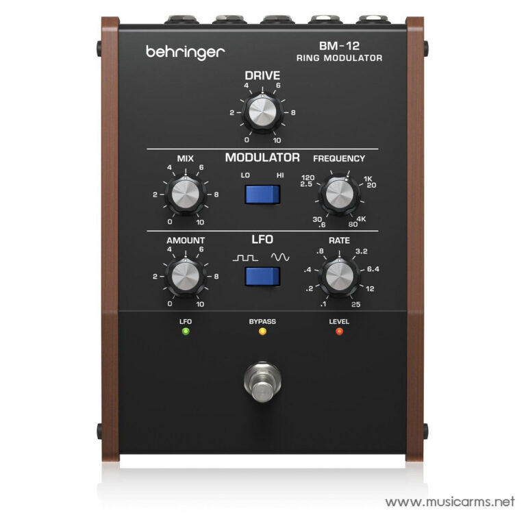 Behringer BM-12 Ring Modulator ได้รับแรงบันดาลใจจากแป้นเหยียบ Ring Modulator ที่โดดเด่นและเป็นเอกลักษณ์ในช่วงปลายยุค 90 ซึ่งเป็นเครื่องมือที่สมบูรณ์แบบในการนำเสียงกีตาร์หรือซินธิไซเซอร์ของคุณก้าวไปสู่มิติใหม่ ไม่ว่าจะเป็นเสียงเมทัลลิกที่มีความกลิทช์ (glitchy), ฮาร์โมนิกที่ยุ่งเหยิงและเสียงแตก, หรือเอฟเฟกต์ที่คล้ายกับ Tremolo แบบสั่นไหวที่ไม่เหมือนใคร BM-12 สามารถครอบคลุมได้ทั้งหมด ด้วยการควบคุม I/O, Drive และ LFO ที่คิดมาอย่างดี ทำให้ Behringer BM-12 พร้อมที่จะยกระดับดนตรีของคุณทั้งบนเวทีและในสตูดิโอ