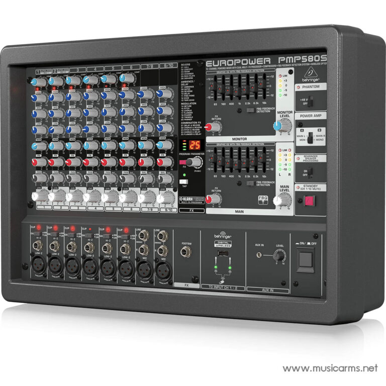 กิจกรรมขนาดกลางต้องการมิกเซอร์พร้อมภาคขยายเสียง PMP580S ที่ยอดเยี่ยมและน้ำหนักเบา (6.9 กก./15.2 ปอนด์) ใช้งานง่าย 10 แชนเนล 500 วัตต์ PMP580S เป็นมิกเซอร์พร้อมภาคขยายเสียงที่มีประสิทธิภาพและราคาไม่แพงที่สุดสำหรับงานนี้ และยังสามารถใช้เป็นมิกเซอร์อนาล็อกล้วน – หรือเป็นเพาเวอร์แอมพลิฟายเออร์ล้วนๆ ได้ด้วย ด้วยไมค์ปรีแอมป์คุณภาพสูงพร้อมคอมเพรสเซอร์แบบ “one-knob”, โปรเซสเซอร์ KLARK TEKNIK 24-bit Multi-FX, การเชื่อมต่อไมโครโฟนไร้สาย ULM และ Dual 7-band Graphic EQ พร้อมระบบ FBQ Feedback Detection ของเรา – PMP580S ทำให้การให้คุณภาพเสียงที่ยอดเยี่ยมกับการแสดงสาธารณะทุกประเภทง่ายกว่าที่เคย