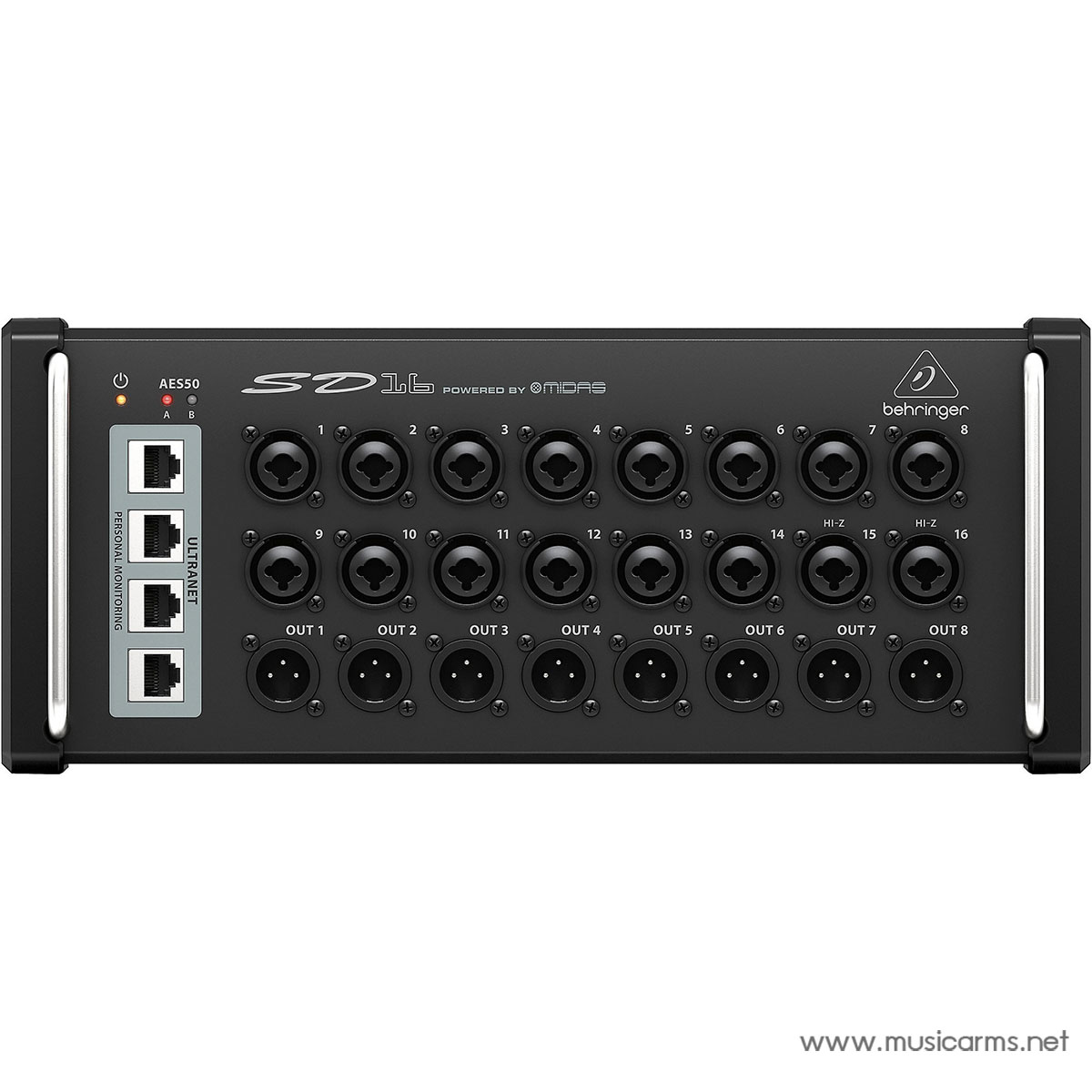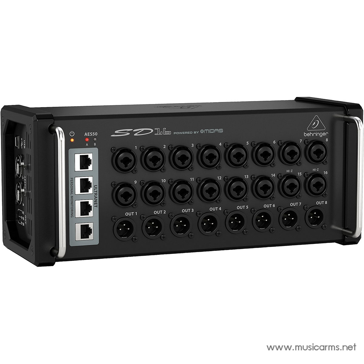 Behringer SD16 เป็น stage box ที่ให้คุณภาพเสียงที่ชัดเจนและการตั้งค่าที่ง่ายดายสำหรับการแสดงสดของคุณ ด้วยพรีแอมป์ไมโครโฟน 16 ช่องที่ออกแบบโดย Midas, SD16 จึงมอบเสียงที่ชัดเจนและละเอียดสำหรับทุกการเชื่อมต่อ เพียงแค่ใช้สาย Cat5e เส้นเดียวจาก stage box ไปยังคอนโซลมิกซ์ ก็สามารถส่งสัญญาณเสียง 16 ช่อง ลดความยุ่งเหยิงของสายเคเบิลที่มีอยู่ทั่วเวที ฮับ ULTRANET ในตัวจะส่งเสียงดิจิตอล 16 ช่องและพลังงานแฟนทอมไปยังเครื่องมอนิเตอร์ส่วนบุคคล Behringer P16-M โดยไม่ต้องใช้ฮาร์ดแวร์เพิ่มเติมและสายเคเบิลหลายเส้น นอกจากนี้ยังมีช่อง Hi-Z combo 2 ช่องเพื่อเชื่อมต่อเครื่องดนตรีเช่น คีย์บอร์ด กีต้าร์อะคูสติก และอื่นๆ ได้โดยตรง พร้อมช่อง USB สำหรับการอัปเดตเฟิร์มแวร์จากคอมพิวเตอร์