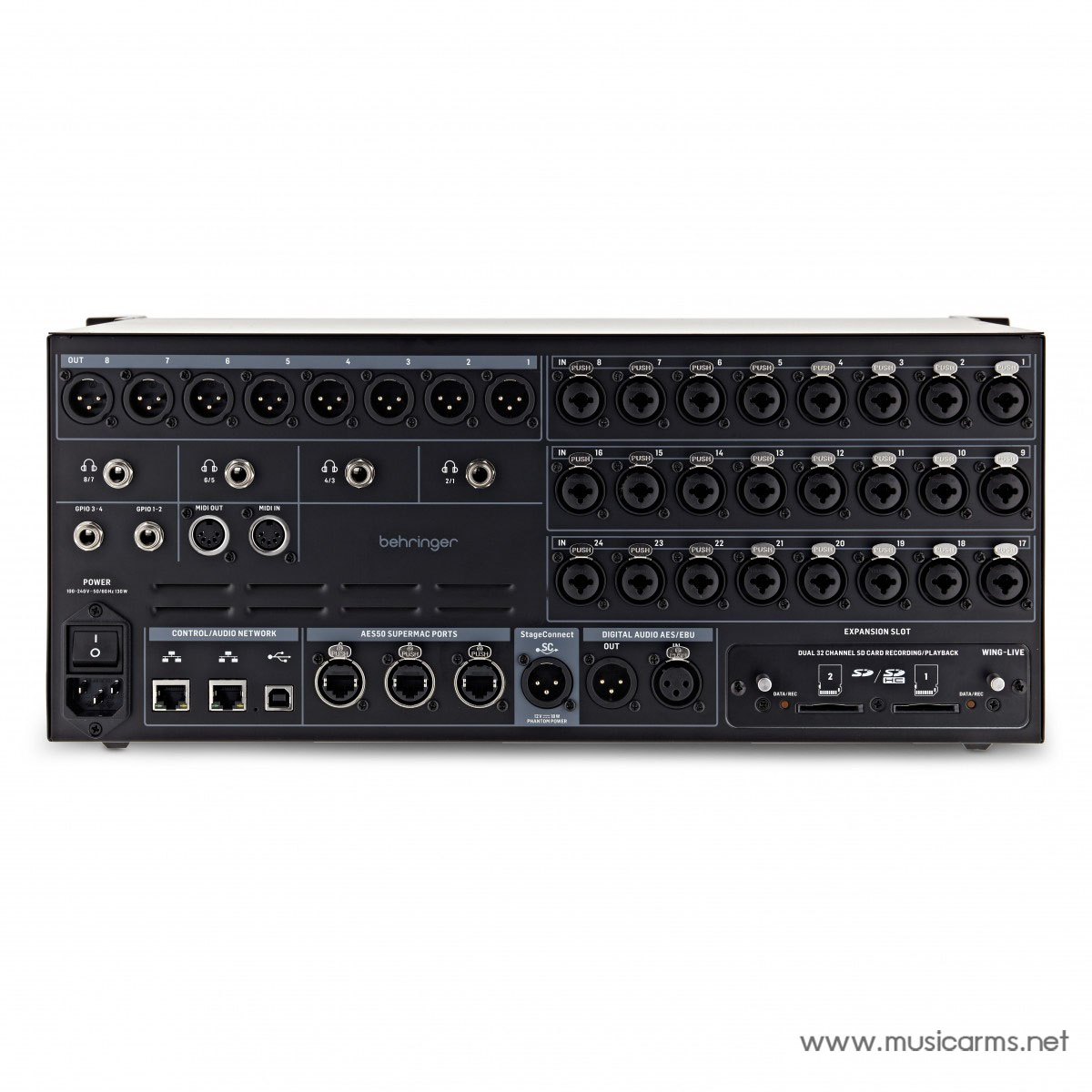 Behringer Wing Rack เป็นเครื่องผสมเสียงดิจิตอลแบบแร็คมอนท์ที่รองรับ 48 แชนแนล และ 28 บัส ที่สามารถทำงานในระบบเสียงสเตอริโอเต็มรูปแบบ ออกแบบมาเพื่อใช้งานในสภาพแวดล้อมแบบมืออาชีพ โดยมีปรีแอมป์ไมค์ MIDAS PRO จำนวน 24 ตัว และเอาต์พุต 8 ช่อง ที่ให้คุณภาพเสียงระดับอุตสาหกรรม ส่วนหน้าปัดสามารถปรับระดับได้อย่างต่อเนื่อง เพื่อความสะดวกสบายในการมิกซ์เสียงเมื่อใช้งานในแร็ค นอกจากนี้ยังรองรับการเชื่อมต่อ 3 พอร์ต AES50 ที่สามารถรองรับสัญญาณอินพุต/เอาต์พุตได้ 144 ช่องผ่านการเชื่อมต่อ SuperMac CAT5 และมีหน้าจอแสดงผลแบบมัลติทัชขนาด 10.1 นิ้ว รวมถึงพอร์ตอีเธอร์เน็ตคู่เพื่อรองรับ AoIP ตัวเครื่องยังมาพร้อมกับอินเทอร์เฟซ USB, ระบบบันทึกเสียงผ่านการ์ด SD คู่, เครื่องเอฟเฟกต์สเตอริโอ 16 แชนแนล และการควบคุม DAW ระยะไกล