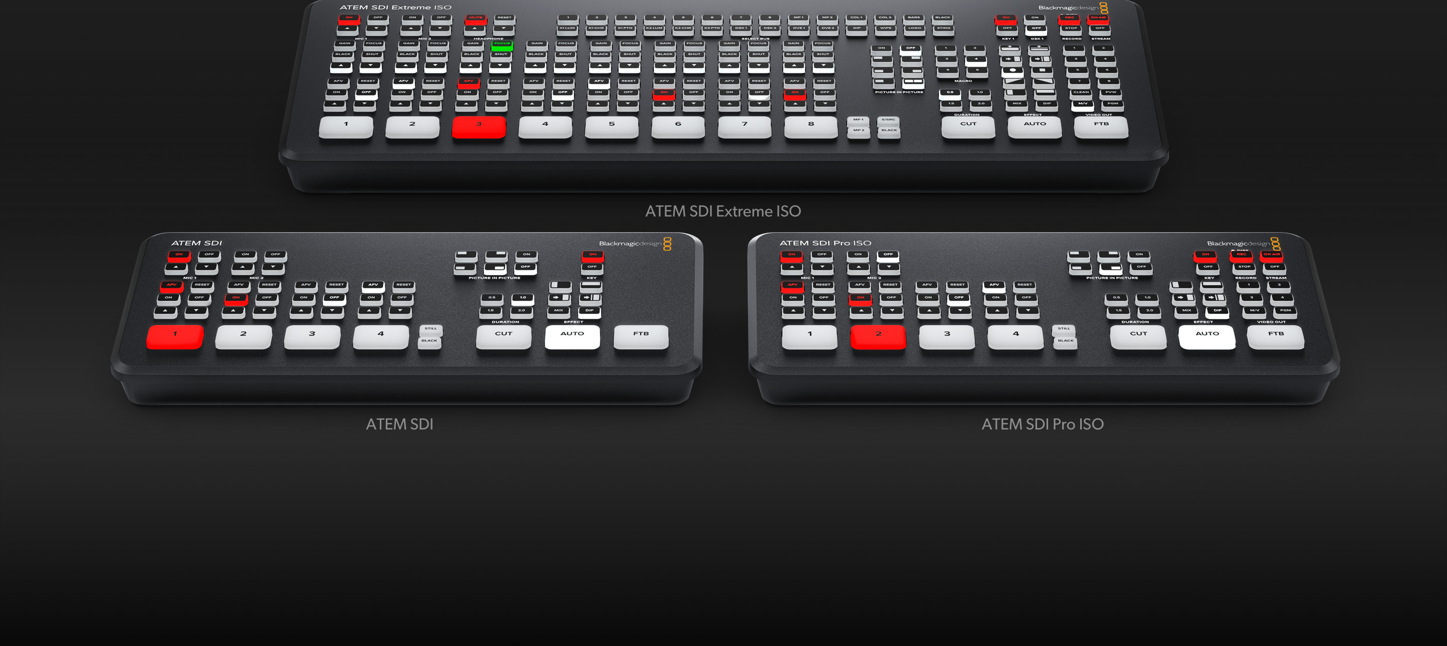 Blackmagic Design ATEM SDI Extreme ISO เป็นสวิตเชอร์ไลฟ์โปรดักชันที่มีคุณสมบัติครบครันของ ATEM SDI Pro ISO แต่เพิ่มจำนวนอินพุต SDI เป็น 8 ช่อง และเอาต์พุต SDI 4 ช่อง ทำให้สามารถเชื่อมต่อแหล่งวิดีโอได้มากขึ้น และยังสามารถบันทึกวิดีโอ H.264 แบบ ISO ได้สูงสุดถึง 9 สตรีมพร้อมกันแบบเรียลไทม์ (อินพุต Clean Feed 8 ช่อง และวิดีโอโปรแกรม 1 ช่อง) เพื่อรองรับการตัดต่อแบบมัลติแคมที่สมบูรณ์แบบ นอกจากนี้ยังสร้างไฟล์โปรเจกต์ DaVinci Resolve โดยอัตโนมัติสำหรับการแก้ไขหลังการผลิตที่สะดวกและรวดเร็ว