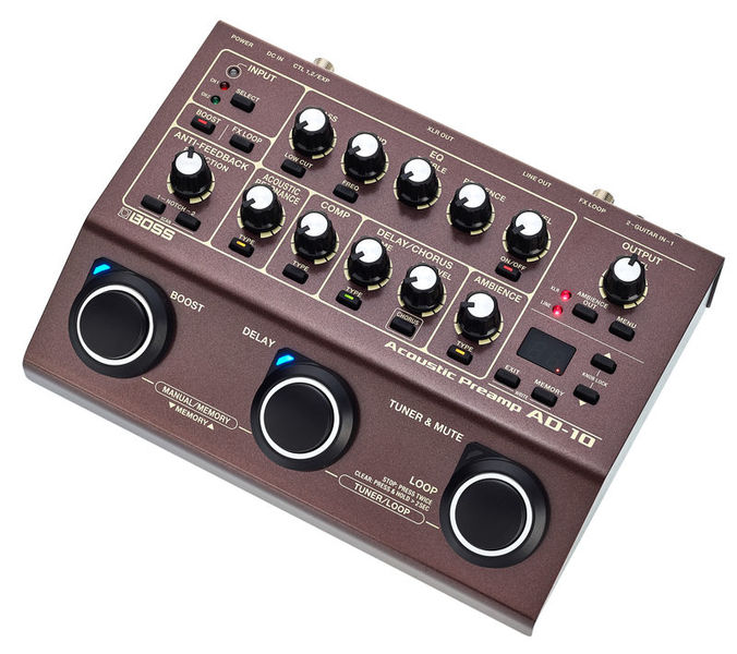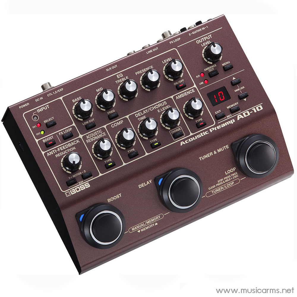 Boss AD-10 เอฟเฟคแบบอะคูสติกรุ่นใหม่ที่ทำมาเอาใจสายอะคูสติกโดยเฉพาะ รุ่นนี้จะมี 2 แชนแนล ใช้งานเครื่องดนตรีได้ 2 เครื่องพร้อมกัน ให้เสียงที่นุ่มละมุนและเป็นธรรมชาติเหมือนกำลังเล่นกีต้าร์โปร่งเสียงใสๆ มีจุดเด่นเรื่องเอฟเฟคที่ให้มาครบครันทั้ง Chorus, Delay,Reverb ในตัวและปรับ EQ ได้ถึง 4 แบนด์ และยังมีช่องเสียบ XLR ที่เชื่อกับตัวแอมป์ได้ง่าย รวมถึงสามารถต่อ USB เพื่อทำเพลงได้ ให้เสียงดี เหมาะสำหรับมืออาชีพด้านกีต้ารือะคูสติกอย่างแท้จริง