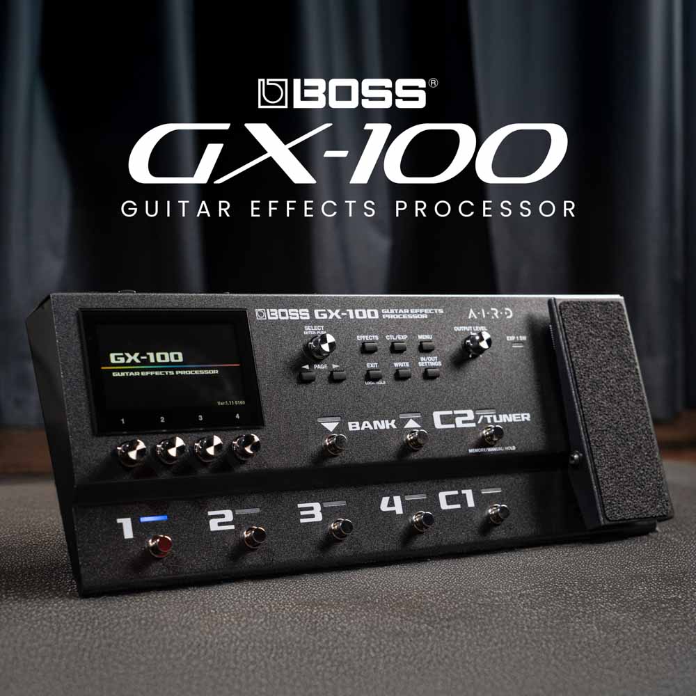 Fusing advanced BOSS tone technologies into a sleek, ultra-modern hardware design, the inspiring GX-100 delivers top-level performance everywhere you play. Explore 23 AIRD amplifiers and over 150 effects derived from the flagship GT-1000, and craft great sounds in seconds with the intuitive color touch display. Up to 15 simultaneous effect blocks provide unlimited tone possibilities, coupled with deep real-time command via onboard footswitches, an expression pedal, and external control support.