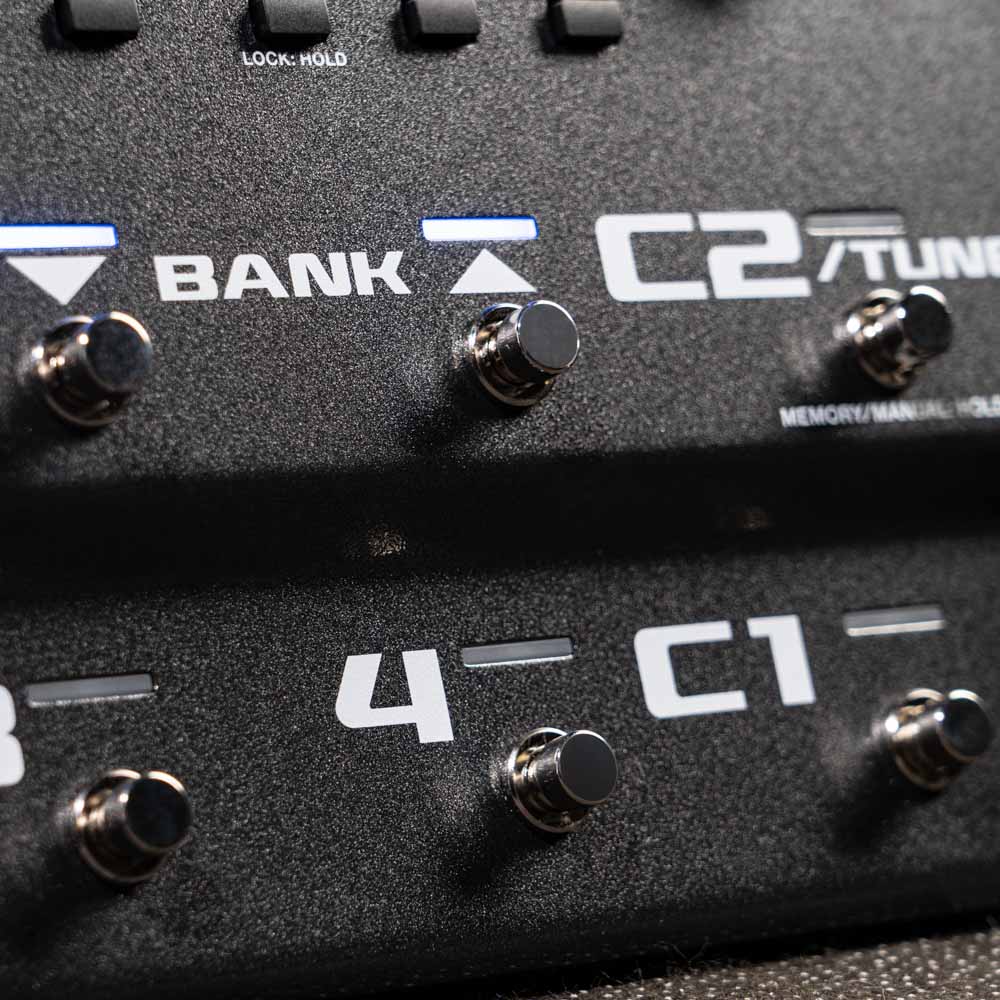 BANK DOWN switch, BANK UP switch, CTL1 switch, CTL2/TUNER switch, 1–4 switches, POWER switch, EXP1 switch, GND LIFT switch