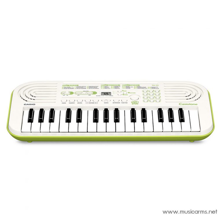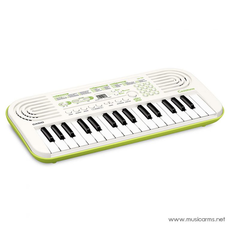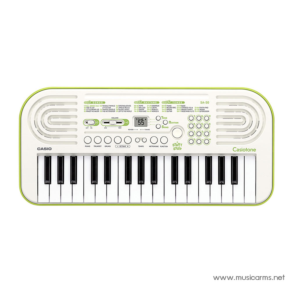 Casio SA-50 คีย์บอร์ดที่เหมาะสำหรับผู้เริ่มต้นหรือคนมองหาคีย์บอร์ดราคาเบาๆไว้ใช้งาน รุ่นนี้จะเป็นแบบ 32 คีย์มินิ โดยจะมีโทนเสียงในเครื่องมากถึง 100 เสียง และจังหวะในตัวอีก 50 จังหวะ นอกจากนี้ยังมีเพลงในเครื่อง 10 เพลงที่พร้อมให้เรียนรู้และเล่นตามได้ด้วยฟังก์ชั่นปิดเมโลดี้ สำหรับฟังก์ชั่นพื้นฐานอย่างเมโทรนอมและ Tempo ก็ใส่มาให้ครบครัน ขนาดเล็กน้ำหนักเบา พกพาไปเล่นข้างนอกได้ง่ายด้วยถ่าน AA เพียง 6 ก้อน ควบคุมง่ายผ่านหน้าจอ LCD สีสันสดใส ใครที่มองหาคีย์บอร์ดเริ่มต้นไม่ควรพลาดกับแบรนด์ดัง