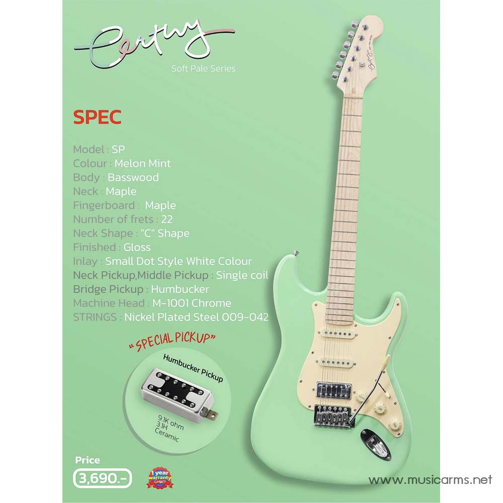 Century Soft Pale series กีตาร์สีสันสดใสซีรี่ส์ใหม่จาก Century ที่เน้นเรื่องการใช้งานครบถ้วนในรูปลักษณ์แบบพาสเทล บอดี้จะเป็นทรง SP สวยงามและเล่นง่าย บอดี้ไม้เบสวูด คอและฟิงเกอร์บอร์ดไม้เมเปิล ได้โทนเสียงกลางที่ชัดเจนและมีความหนาของเสียงครบถ้วน ปิ๊กอัพ 3 ตำแหน่งมีทั้งแบบ Single Coil ที่ตำแหน่งคอและกลาง ส่วนปิ๊กอัพบริดจ์จะเป็น Humbucker ตอบโจทย์ดนตรีทุกแนวเพลง งานประกอบทำออกมาได้ดีเยี่ยมรวมถึงอะไหล่ที่คัดสรรกันมาคุ้มราคา ใครที่ชอบกีตาร์สีสันสดใส คู่ควรกับการมีไว้ในครอบครองอย่างยิ่ง
