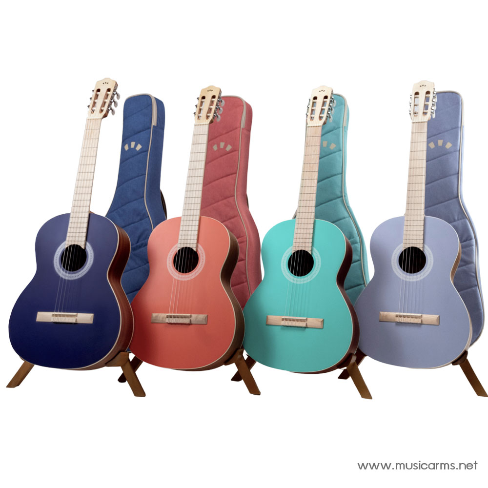 Bring your music to life in full color with the Protégé C1 Matiz! A fresh take on the traditional aesthetic of the nylon-string guitar, the Matiz series combines maple accents and traditional tone woods in 4 eye-catching colors: Aqua, Coral, Pale Sky, and Classic Blue. Spruce top and mahogany back and sides provide the projection and warmth associated with a nylon string guitar, while the maple headplate, bridge, and full-scale fretboard give the C1 Matiz an all new look with a lively tonal response. A satin polyurethane finish provides a layer of protection against nicks and scratches, while the ghost rosette, designed after our traditional wood rosette, allows the eye-catching colored tops of the C1 Matiz to shine through and take center stage. Includes a color-matched gig bag made of recycled nylon so you can rest easy knowing your instrument is protected in responsible and sustainable fashion.