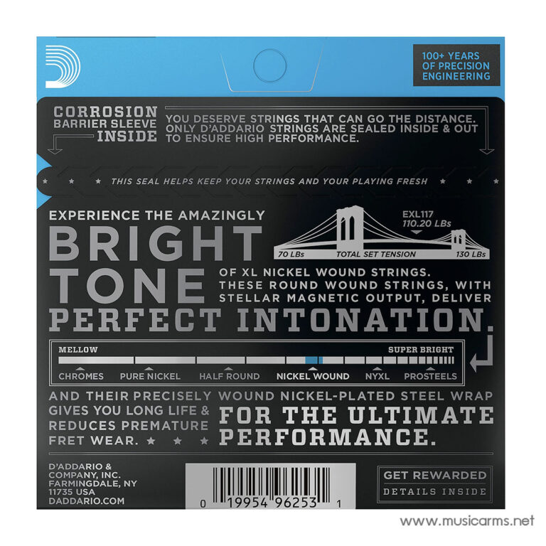 D’Addario ใช้เทคโนโลยีการพันสายแบบควบคุมด้วยคอมพิวเตอร์ที่ทันสมัยที่สุด เพื่อให้ได้สายกีตาร์ที่มีความสม่ำเสมอและการออกเสียงที่แม่นยำ ด้วยมาตรฐานการผลิตที่เข้มงวด EXL117 จึงมีความตึงที่สมดุล ให้เสียงที่เต็มอิ่มและกังวาน พร้อมโน้ตที่ชัดเจนตลอดทั้งคอกีตาร์