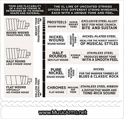 - Round wound with nickelplated steel for a distinctive bright tone with clear fundamentals