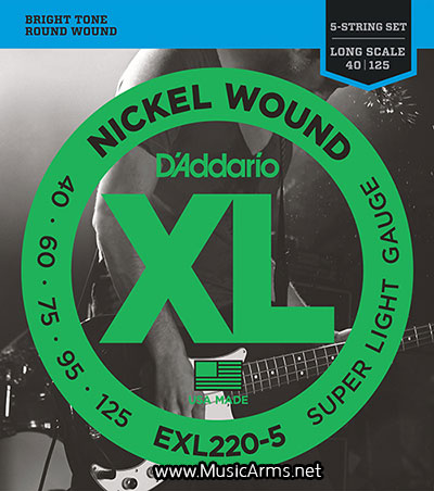 D’Addario EXL220-5 5-String Nickel Wound คือ สายกีต้าร์เบส5สายที่ได้รับความนิยมมากที่สุดในชุดของ EXL220 เนื่องจากมีสายเพิ่มมาเป็น5สายทำให้เพิ่มความยืดหยุ่นในการเล่นของผู้เล่น โดยยังคงความเป็นเอกลักษณ์ของ XL Nickel Wound ที่มีความง่ายต่อการเล่น ให้โทนเสียงที่ดี