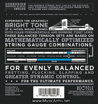 D’Addario EXL220BT – สายเบสที่ให้ความสมดุล ด้วยการเพิ่มประสิทธิภาพ ให้ความสะดวกสบายในการเล่น บวกกับโทนเสียงสดใสโดดเด่น แต่ละชุดมีการควบคุมแบบไดนามิกมากขึ้นและความรู้สึกที่สอดคล้องกันมากขึ้น