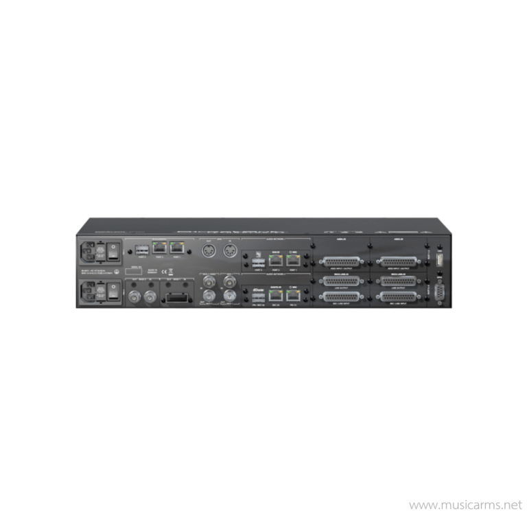 There are slots for different I/O modules A, B, and C, allowing for customizable I/O configurations according to requirements (such as Analog, MADI, AES3, Dante, RAVENNA/AES67, SoundGrid, AVB/MILAN). It supports a variety of audio network connections and comprehensive leading audio networking protocols (such as RAVENNA/AES67, Dante, SoundGrid, and AVB/MILAN). It uses FPGA for low-latency processing in powerful DSP operations, featuring Matrix Mixers, Summing Busses, Flex-Channels, and AutoMix, along with various plugins such as FIR/IIR Filters, Dynamics, and Delays. It can simultaneously convert media, formats, and sample rates up to 192 kHz. It includes EARS™ (Enhanced Automatic Redundancy Switching) technology for automatic input switching in case of failure. Control is possible via Globcon software or the built-in web browser GUI.