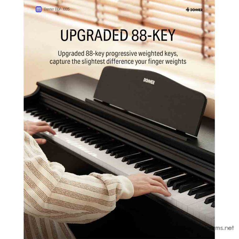 Donner DDP-400 Upright Digital Piano ที่ได้ทั้งความสวยงามในดีไซน์แบบ Upright และการใช้งานแบบเปียโนไฟฟ้า ตัวคีย์โปรเกรสซีฟฮาร์เมอร์ขนาดเต็ม 88 และการออกแบบหน้าสัมผัสคู่ จับคู่การเปลี่ยนแปลงความแรงของนิ้วได้อย่างแม่นยำ ให้ประสิทธิภาพที่เทียบได้กับเปียโนระดับพรีเมียม