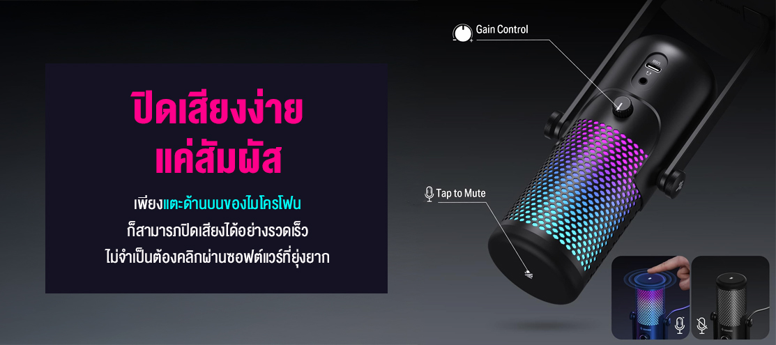 การปิดเสียงแบบสัมผัสของไมโครโฟนช่วยให้คุณหลีกเลี่ยงการขัดจังหวะที่น่าอับอายได้อย่างรวดเร็ว เพียงแตะด้านบนของไมโครโฟนเพื่อปิดเสียงด้วยท่าทางเดียว จึงไม่จำเป็นต้องคลิกผ่านซอฟต์แวร์ที่ยุ่งยาก