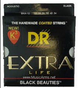 DR BKA-12 Extra Life Black Beauties Medium Acoustic Guitar Strings– สายกีต้าร์โปร่ง รุ่นExtra Life Black Beauties สีดำ ใช้เทคโนยีการเคลือบ K3 ซึ่งเป็นสิทธิบัตรของ DR นักดนตรีหลายเสียงได้บอกว่า ให้เสียงที่ดีกว่าแบบไม่เคลือบสาย ทั้งนี้ การเคลือบสายยังมีประโยชน์คือ ช่วยป้องกันการกัดกร่อนและเหงื่อจากมือผู้เล่นได้ เสียงที่ได้ก็มีความใสและดี ไม่ต่างกับแบบไม่เคลือบสาย