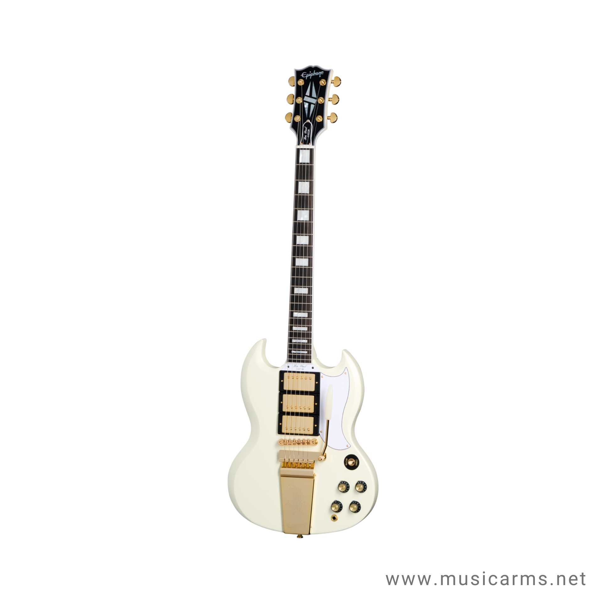 Epiphone 1963 Les Paul SG พร้อมด้วย Maestro Vibrola สร้างขึ้นด้วยความร่วมมือกับ Gibson™ Custom โดยเป็นการรังสรรค์นาฬิการุ่นวินเทจคลาสสิกอันน่าทึ่ง ปี 1963 เป็นปีสุดท้ายที่มีการใช้ชื่อเล่น “Les Paul™” กับ SG™ Custom และเป็นปีแรกสำหรับ Maestro™ Vibrola™ สินค้าระดับพรีเมียมที่รุ่นนี้เป็นที่รู้จักและชื่นชอบมีอยู่ที่นี่ รวมถึงคอไม้มะฮอกกานีชิ้นเดียวพร้อมเดือยคอยาว โปรไฟล์ SlimTaper™ และเฟรตบอร์ดไม้มะเกลือแบบผูก นอกจากนี้ยังมีการฝังฟิงเกอร์บอร์ดแบบบล็อกมาเธอร์ออฟเพิร์ล และการฝังเฮดสต็อคเพชรแบบแยกแบบกำหนดเองบนเฮดสต็อคแบบ bound book สไตล์ Gibson ระบบอิเล็กทรอนิกส์ก็น่าประทับใจไม่แพ้กัน ด้วยปิ๊กอัพฮัมบัคเกอร์ USA Gibson Custombucker สามตัวที่ต่อสายด้วยมือกับโพเทนชิโอมิเตอร์ CTS®, ตัวเก็บประจุ Mallory™ และสวิตช์สลับตัวเลือกปิ๊กอัพ Switchcraft® และแจ็คเอาท์พุต พื้นผิว VOS (Vintage Original Sheen) Classic White ได้รับการเสริมอย่างดีจากฮาร์ดแวร์สีทอง รวมถึงจูนเนอร์ Grover® Rotomatic® ในอัตราส่วน 18:1 เคสแข็งสีดำพร้อมกราฟิก Inspired by Gibson Custom และการตกแต่งภายในสีทองรวมอยู่ด้วย