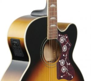 Epiphone EJ-200SCE เเบรนด์กีต้าร์จาก USA. มีความเป็นทรงจัมโบ้ ไซร์ใหญ่ ด้วยไม้หน้าท๊อปโซลิทสปูซ ข้างเเละหลังทำจากไม้เมเปิ้ล ทำให้เนื้อเสียงมีความใสเเละนุ่มละมุนผสมกัน รวมถึงยังมีปิ๊กอัพของ Fishman ติดด้านข้างมาให้อีกด้วย สามารถจูนเสียงในตัวได้ เพิ่มเสียงออกตู้แอมป์ได้ ด้วยความที่เป็นทรงจัมโบ้ จึงทำให้เนื้อเสียงที่เล่นออกมามีความชัดเจน ใสกังวาน แถมมีหลายสีให้เลือก ไม่ว่าจะเป็นสีดำ สันเบิร์ด หรือสีไม้ วัสดุในการทำมีความเเข็งเเรงเเละดีไซร์สวย เรียกได้ว่าเป็นทรงจัมโบ้ที่คุ้มค่าทั้งเรื่องเสียงเเละราคาจริงๆครับ