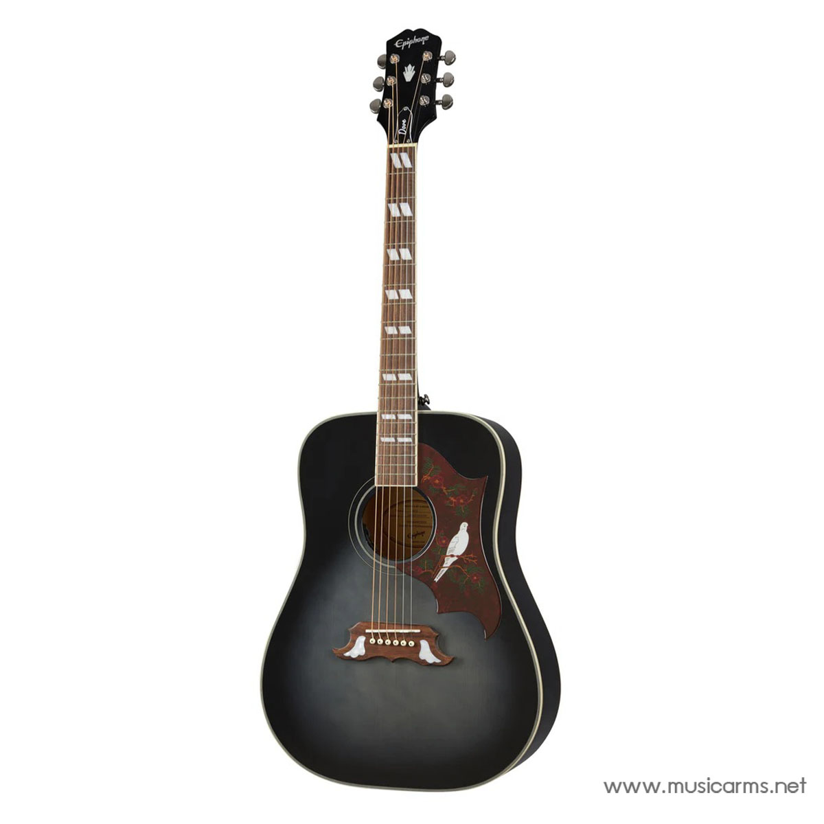In keeping with tradition, The Dove Studio’s back and sides are made from maple for a bright and lively character. A solid spruce top ensures impressive projection adds nuanced overtones. If you’ve never played a guitar with a solid top before, you’ll immediately notice the difference. A solid top is more responsive and has more harmonic content than a laminate top. In the coming years, that solid top will gradually “break-in” and enhance the tone even further. We feel confident that you’ll want to hold onto the Epiphone Dove Studio for a lifetime.