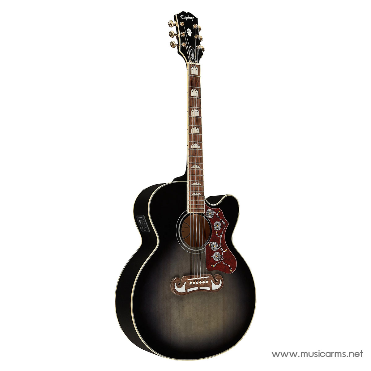 ด้วยปิ๊กการ์ดลายกระดองเต่า บริดจ์ทรง Mustache และอินเลย์ลายมงกุฎ ทำให้ J-200 EC Studio ดูเหมือนตำนานอะคูสติกทุกประการ ลูกบิดสีทองแบบ Die-cast ฮาร์ดแวร์ และหัวกีตาร์ทรง Dovewing อันเป็นเอกลักษณ์ของ Epiphone เติมเต็มสุนทรียภาพที่ได้แรงบันดาลใจจากวินเทจ