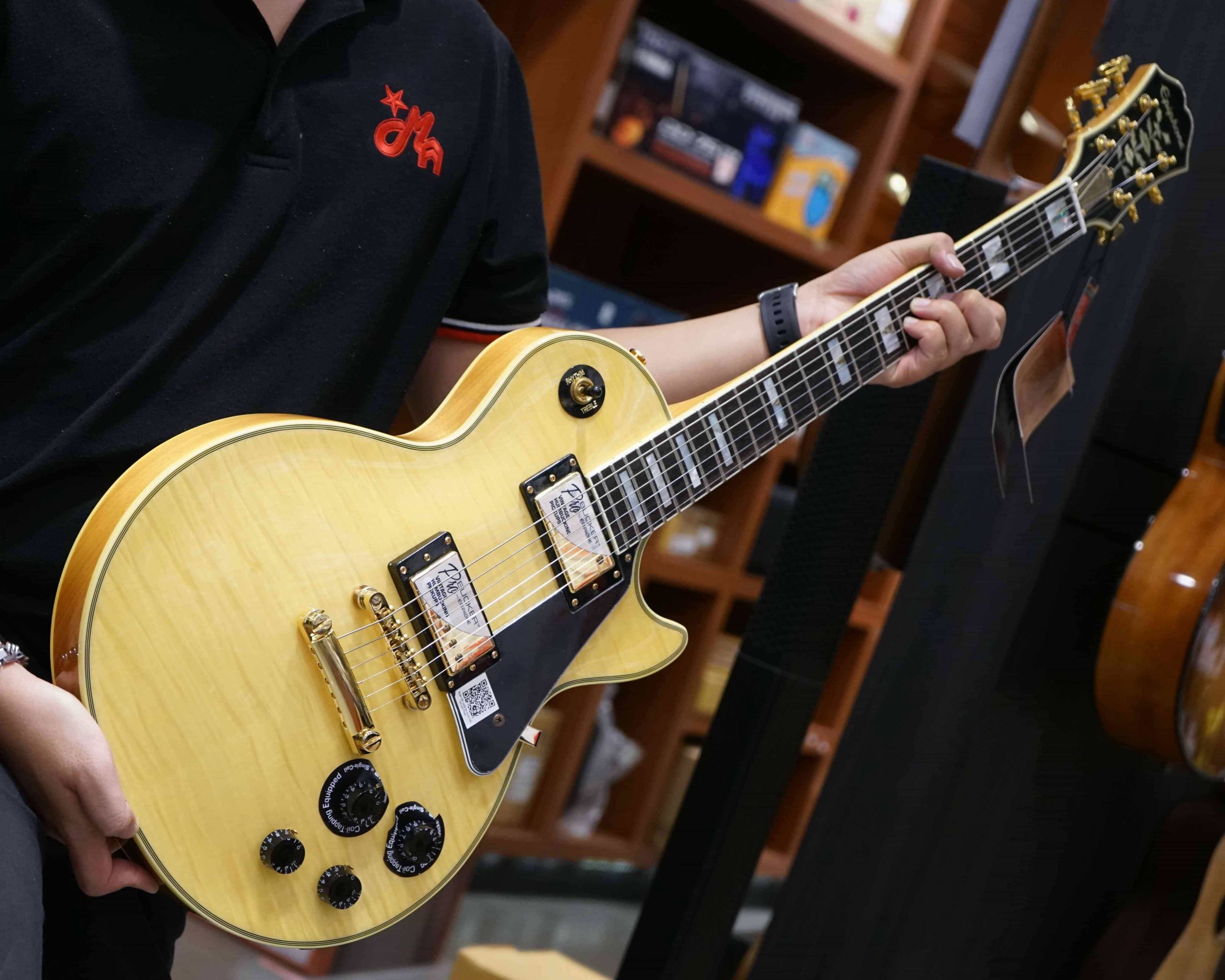 - ไม้ส่วนหัวกีต้าร์เป็นไม้เชอร์รี่ประกบด้วยมะฮอกานีเคลือบด้วยไม้เมเปิ้ลขนาด AAA