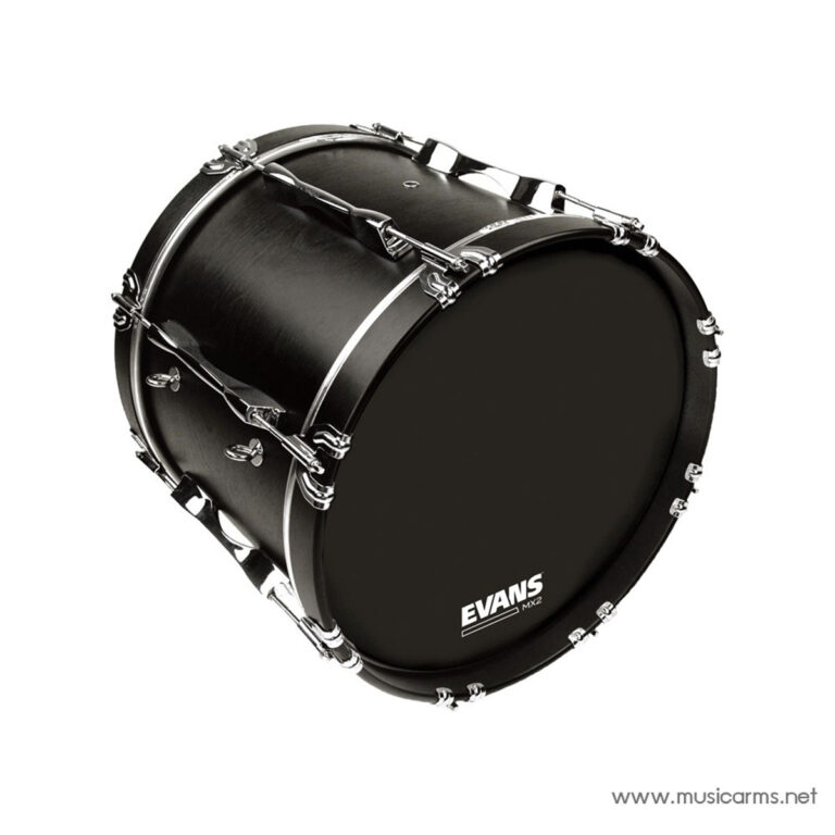 หนังกลองเบสสำหรับมาร์ชชิ่ง Evans MX2 สีดำ ให้โทนเสียงที่สดใส ชัดเจน และเต็มอิ่ม ซีรีส์ MX มีฟิล์ม 2 ชั้น หนา 7.5 มิลลิเมตร และระบบลดเสียงสะท้อนที่เป็นเอกลักษณ์ ซึ่งสามารถปรับแต่งได้โดยการติดแผ่นสักหลาดที่ให้มา เพื่อเพิ่มความชัดเจนของตัวโน้ตและเน้นเสียงต่ำ ทั้งสำหรับการแสดงในร่มและกลางแจ้ง