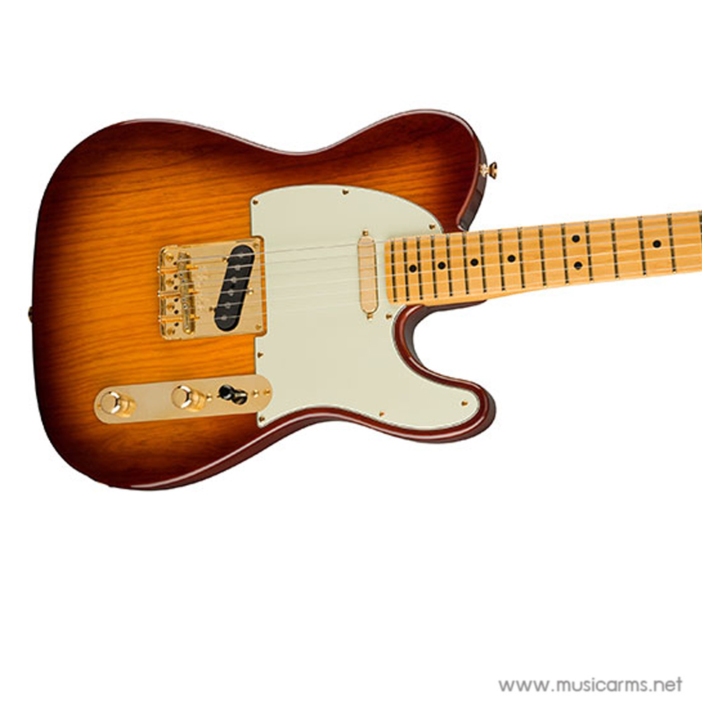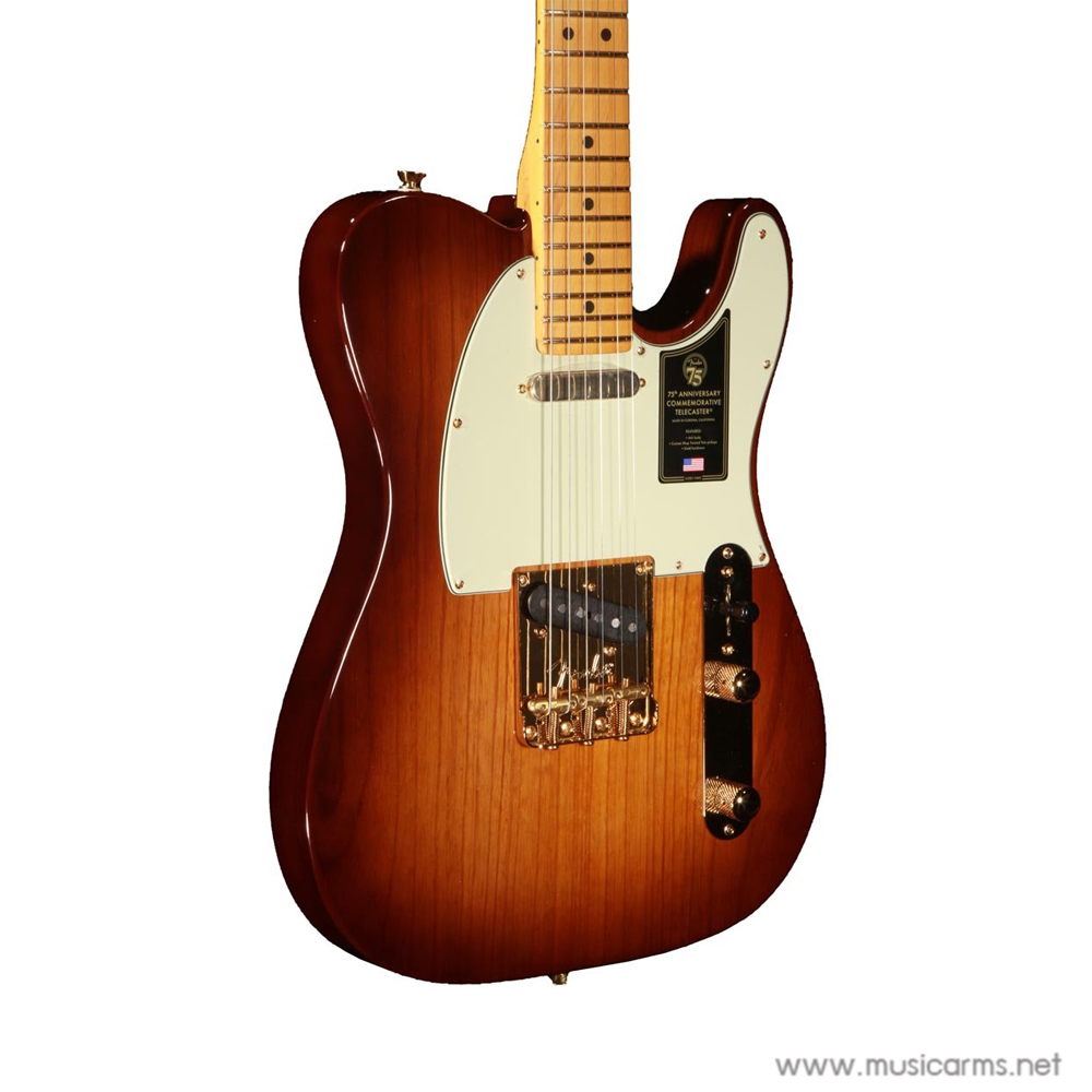 Fender 75th Anniversary Commemorative Telecaster กีตาร์ทรง Telecaster ที่ระลึกครบรอบ 75 ปีจากปี 1946 ที่ Leo Fender ได้คิดค้นกีตาร์ทรง Telecaster ขึ้นมาและปฎิวัติวงการกีตาร์อย่างสมบูรณ์แบบ ด้วยการตกแต่งที่เป็นเอกลักษณ์ บอดี้ไม้แอช ฮาร์ดแวร์สีทอง คอไม้เมเปิ้ลชิ้นเดียวโดดเด่นด้วยโปรไฟล์ Deep “C เล่นง่ายสบายมือ เท่านั้นยังไม่พอตัวฟิงเกอร์บอร์ดที่ทำจากไม้เมเปิลยังออกแบบให้ขอบมีความบางเพื่อการเล่นที่ลื่นไหลมากขึ้น 22 เฟรตขนาด Medium Jumbo มาตรฐานของ Tele มายาวนาน