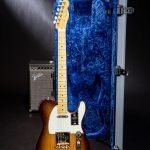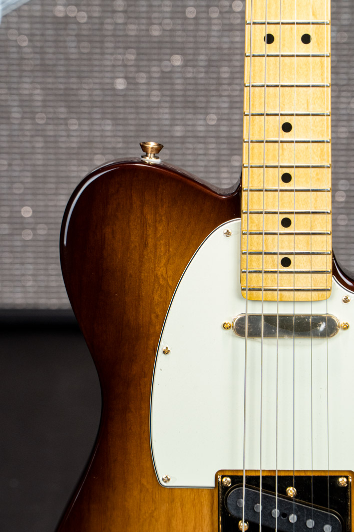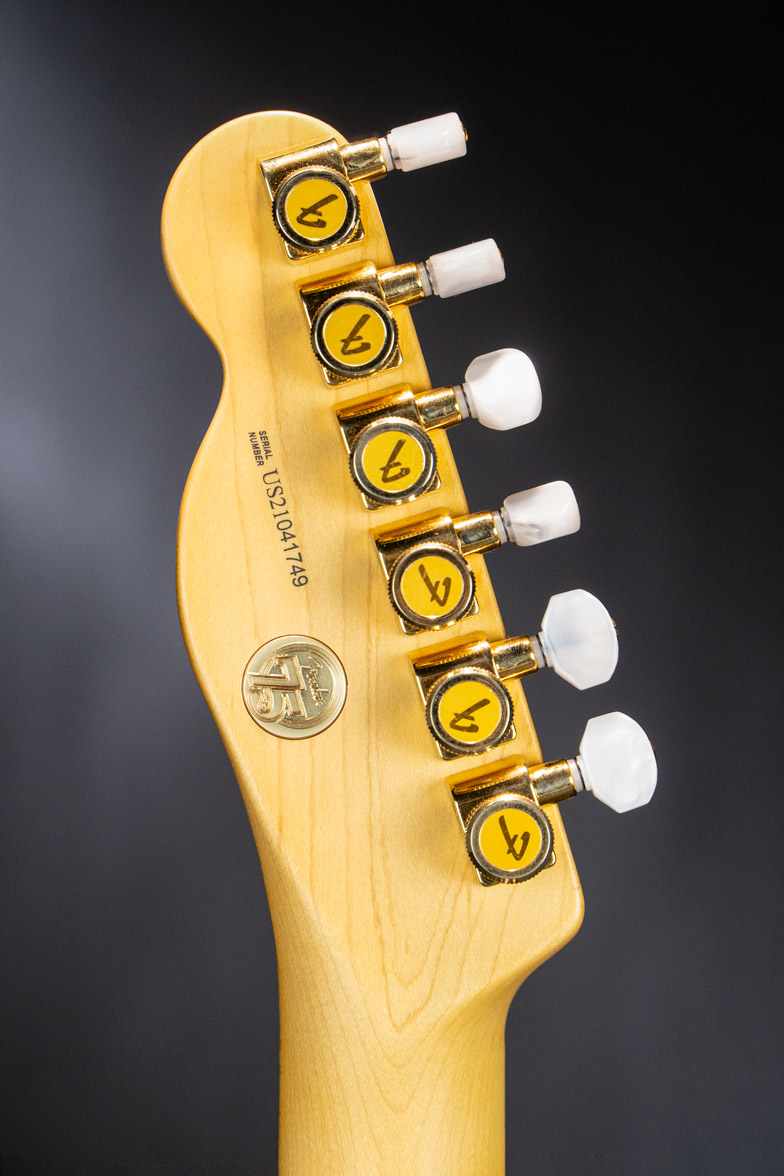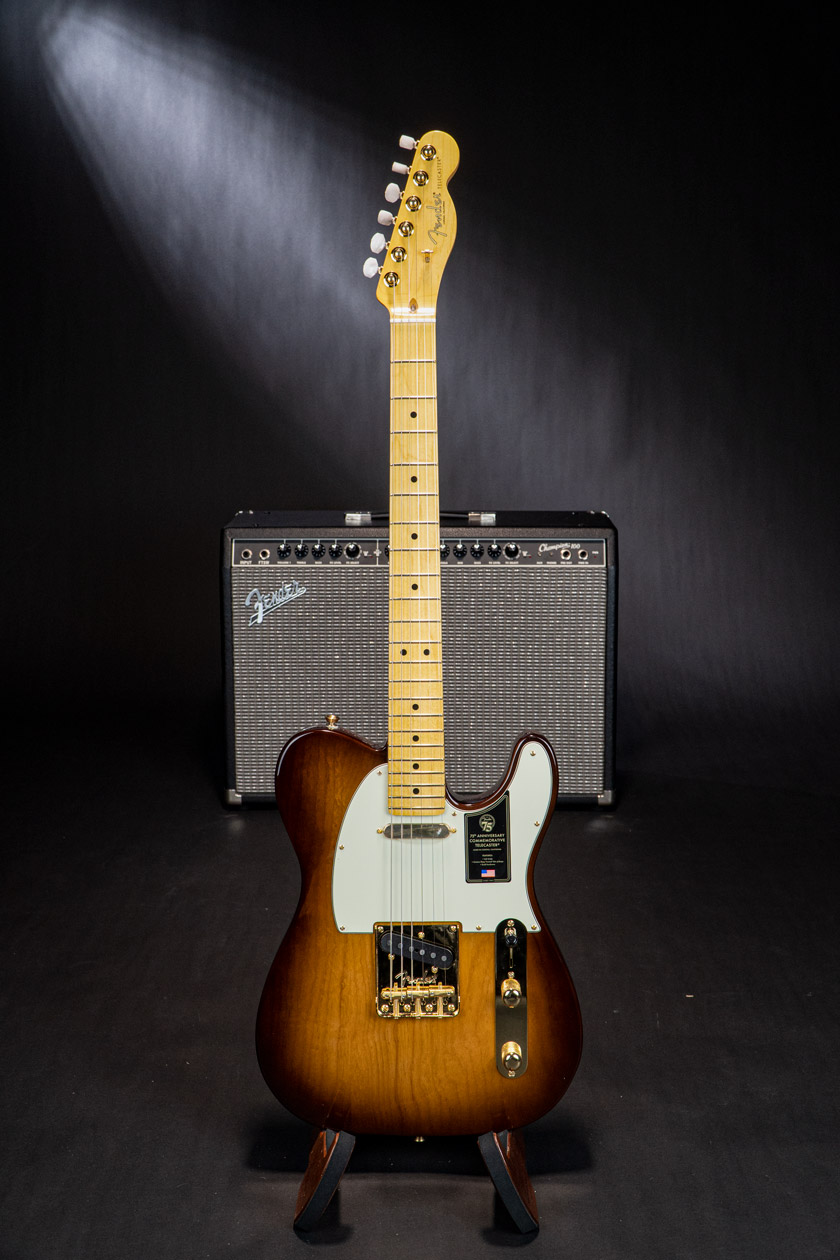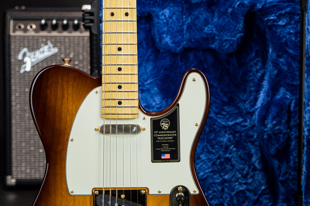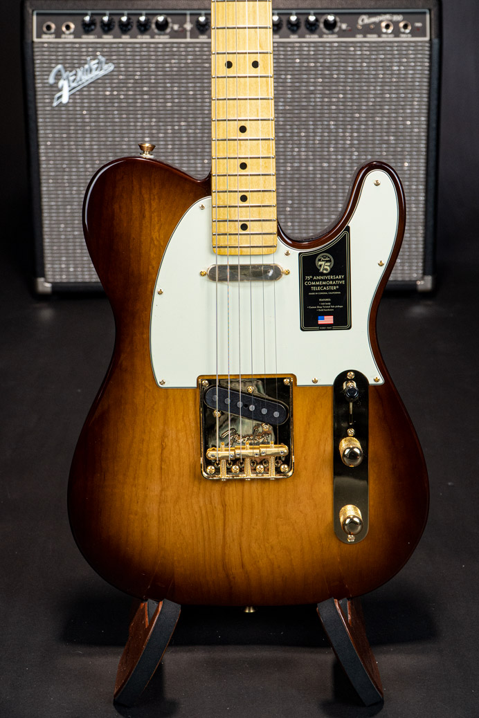The 75th Anniversary Commemorative Telecaster is decked out in a beautiful 2-Color Bourbon Burst finish over ash body, gold hardware and pearl button locking tuners. The one-piece maple neck features a Deep “C” profile, rolled fingerboard edges, a “Super-Natural” satin finish and a sculpted neck heel for unsurpassed comfort and playability. Custom Shop Twisted Tele pickups deliver searing Telecaster twang with sparkle and clarity. A top-load/string- through bridge with compensated “bullet” saddles provides superb intonation and versatility. Finally, every Commemorative Telecaster features special badging with a 75th anniversary ingot inlaid into the back of the headstock and an engraved anniversary neck plate.