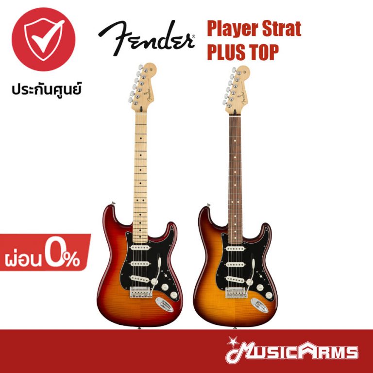 Fender Player Stratocaster Plus Top กีต้าร์ซีรี่ย์ Player สุดฮิต สิ่งที่เสริมมาอีกอย่างคือรุ่นนี้จะเพิ่มลายเฟรมไม้ให้ดูสวยงามขึ้นรับกับสีของกีต้าร์ ตัวคอยังทำแบบโมเดิร์นที่บางลงทำให้จับง่าย กระชับมือ บอดี้กีต้าร์ตามมาตรฐานเฟนเดอร์ที่ทำจากไม้เอลเดอร์ให้เสียงใส เพราะ กังวานอยู่แล้ว ยิ่งลายเฟรมไม้สวยๆแบบนี้เคลือบเงาด้วยโพลียูรีเทนไปด้วย ทำให้ดูเงางามเด่นขึ้นไปอีก