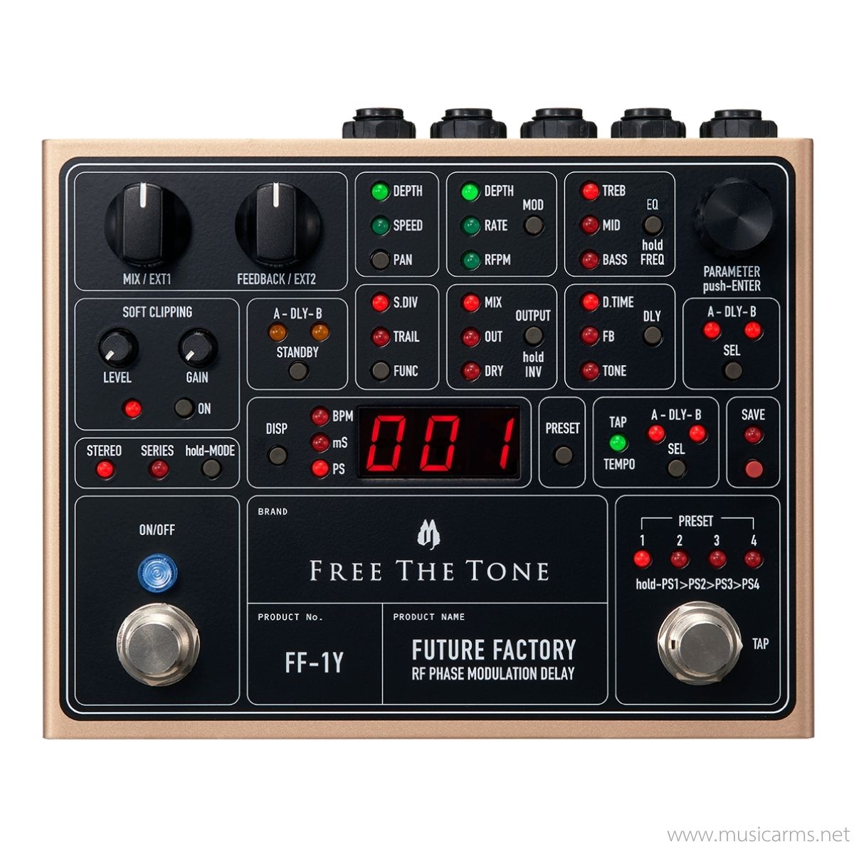 FUTURE FACTORY (FF-1Y) คือเอฟเฟกต์ Dual Delay ระดับเรือธงที่รวบรวมเทคโนโลยีที่ดีที่สุดของ Free The Tone ไว้ด้วยกัน จุดเด่นคือระบบ “RF Phase Modulation” ที่สุ่มการเปลี่ยนแปลงเฟสของสัญญาณเสียง ทำให้ได้มิติเสียงที่กว้างและลึกอย่างที่ไม่เคยมีมาก่อนในดีเลย์ก้อน มาพร้อมการประมวลผล 32-bit และวงจร Analog Mixer เพื่อคุณภาพเสียงสูงสุด