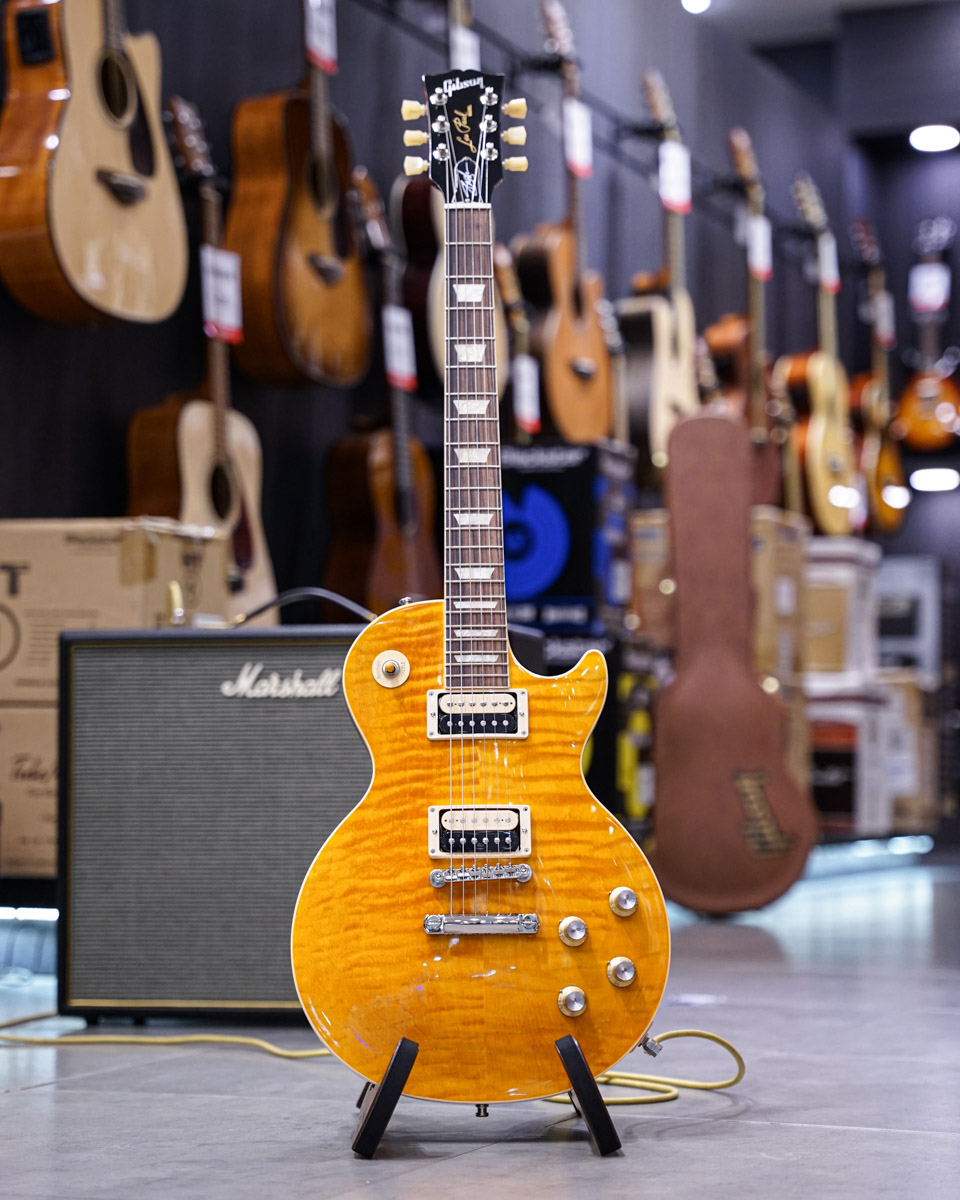 Gibson Slash Les Paul Standard กีต้าร์ซิกเนเจอร์ Slash แห่งวง Gun ‘n Roses ที่เป็นไอดอลของใครหลายคน รุ่นนี้จะเป็นการนำเอาโมเดลของ Stardard มาเป็นต้นแบบแต่ใส่ความวินเทจลงไปด้วย บอดี้ไม้มะฮอกกานีปะหน้าด้วยไม้เฟรมเมเปิ้ลเกรด AAA ได้เสียงที่ลงตัวและลายไม้สวยงาม คอมะฮอกกานีทำทรงคอแบบปี 50 ปิ๊กอัพ Slash Bucker ให้เสียงที่พุ่งแรงสะใจ แน่นอนว่าซาวด์จะใกล้เคียงกับเจ้าตัว ใครที่ชื่นชอบมือกีต้าร์รายนี้ เป็นอีกรุ่นที่น่าหามาสะสมมาก