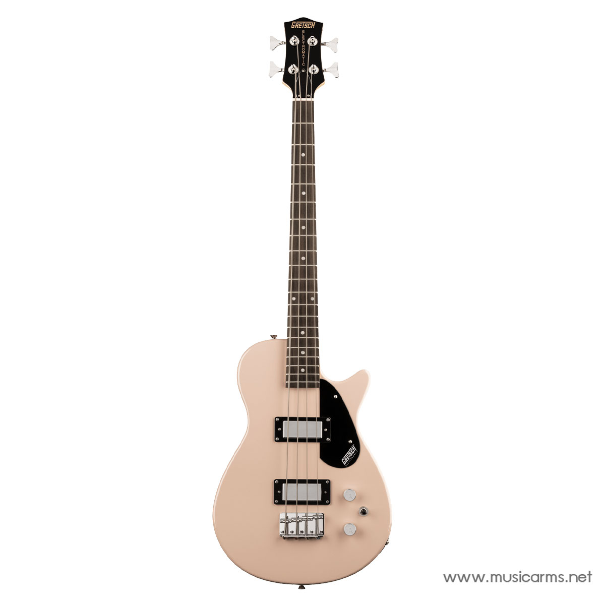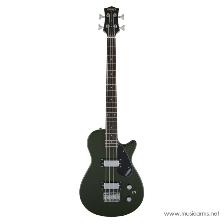Its key features include a 30.3″-shorter scale length for comfortable playability, basswood body, bolt-on maple neck, 12″-radius laurel fingerboard with 20 medium jumbo frets and dot inlays. A pair of Gretsch single-coil bass pickups deliver thundering sound, which can be commanded with a three-position pickup toggle switch, master volume and master tone.