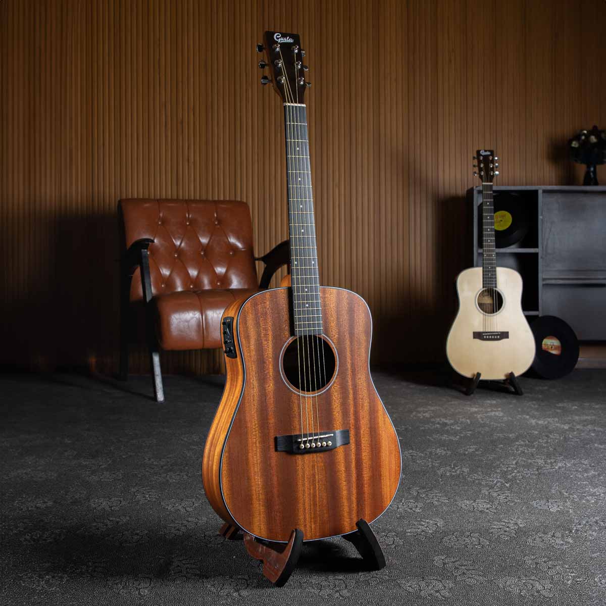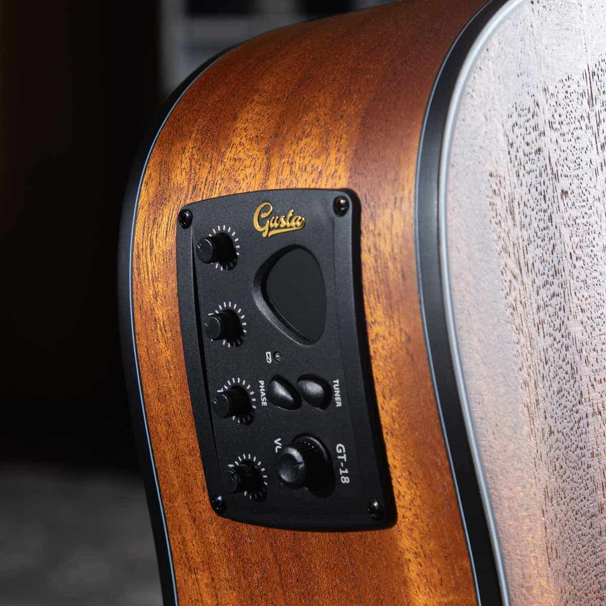 Gusta DJS1-E กีตาร์โปร่งไฟฟ้างานดีที่เอาใจคนชอบซาวด์นุ่มๆของไม้มะฮอกกานี ซึ่งรุ่นนี้บอดี้จะเป็นไม้มะฮอกกานีทั้งหมด มาในทรง Dreadnought Junior ที่มีขนาดบอดี้เล็กกว่าปกติที่ 38 นิ้ว พกพาสะดวกและให้พลังเสียงไม่แพ้ไซส์ใหญ่ คอไม้มะฮอกกานี ฟิงเกอร์บอร์ดโรสวูดตามมาตรฐาน มีขอบไบน์ดิงให้สวยงาม และยังได้ภาคไฟฟ้าเป็นรุ่น Gusta GTS เสียงนุ่มๆใสๆ งานดีไซด์ทำออกมาได้ดีเก็บรายละเอียดครบถ้วน ใครที่มองหากีตาร์โปร่งไฟฟ้าไซส์มินิราคาย่อมเยา รุ่นนี้ถือว่าตอบโจทย์อย่างมาก