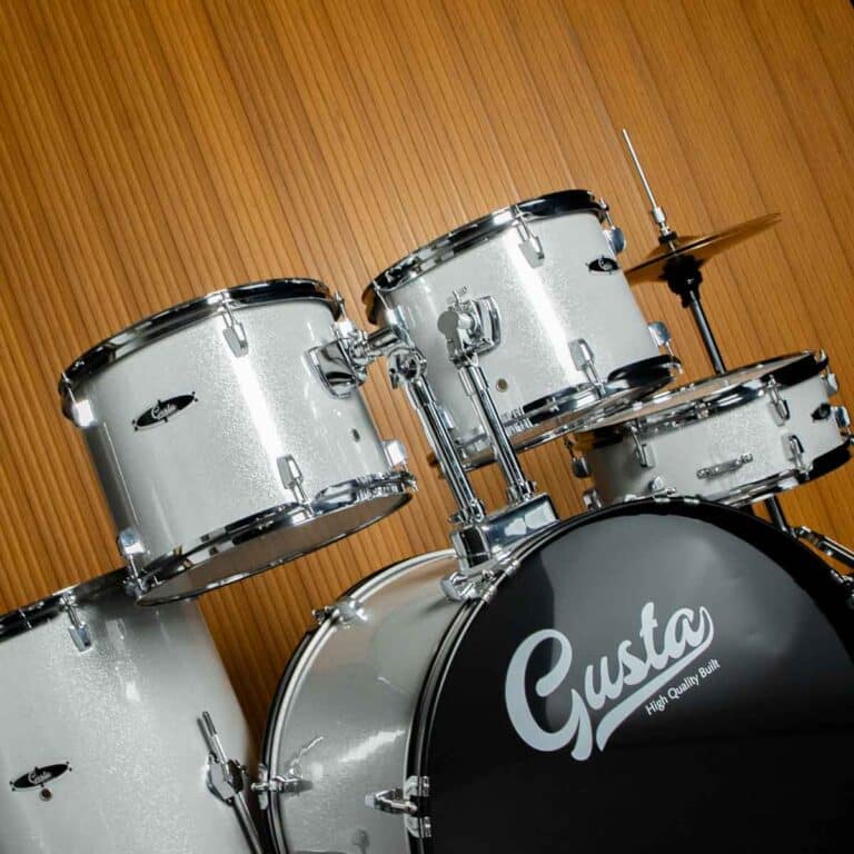 Gusta First Plus กลองชุดแบบ 5 ชิ้น ที่อัพเกรดความพิเศษด้วยอะไหล่กลองจะชุบโครเมี่ยมสีเงินทั้งหมด พร้อมกับการทำสีแบบเมทัลลิค ทำให้ดูสวยงามกว่าเดิม ตัวกลองทำจากไม้ป็อปลาร์ 6 ชั้นซ้อนทับกัน ทำให้ได้เสียงกลางที่ชัดเจน และมีความแข็งแรง ขอบกลองทอมนั้นหนาถึง 1.5 มม. ให้เสียงของกลองที่มีมิติ ตัวกลองเป็นขนาดใหญ่ไม่ว่าเป็น กลองเบสดรัมขนาด 22×18 นิ้ว แบบ 16 หลัก ข้อดีของการมีหลักกลองถึง 16 หลักนี้จะช่วยในการปรับหนังกลองให้มีความหลากหลายขึ้น มาพร้อมฉาบขนาด 16 นิ้ว ทุกอย่างครบพร้อมเล่น สามารถใช้งานได้ทั้งซ้อมหรืองานในสตูดิโอ