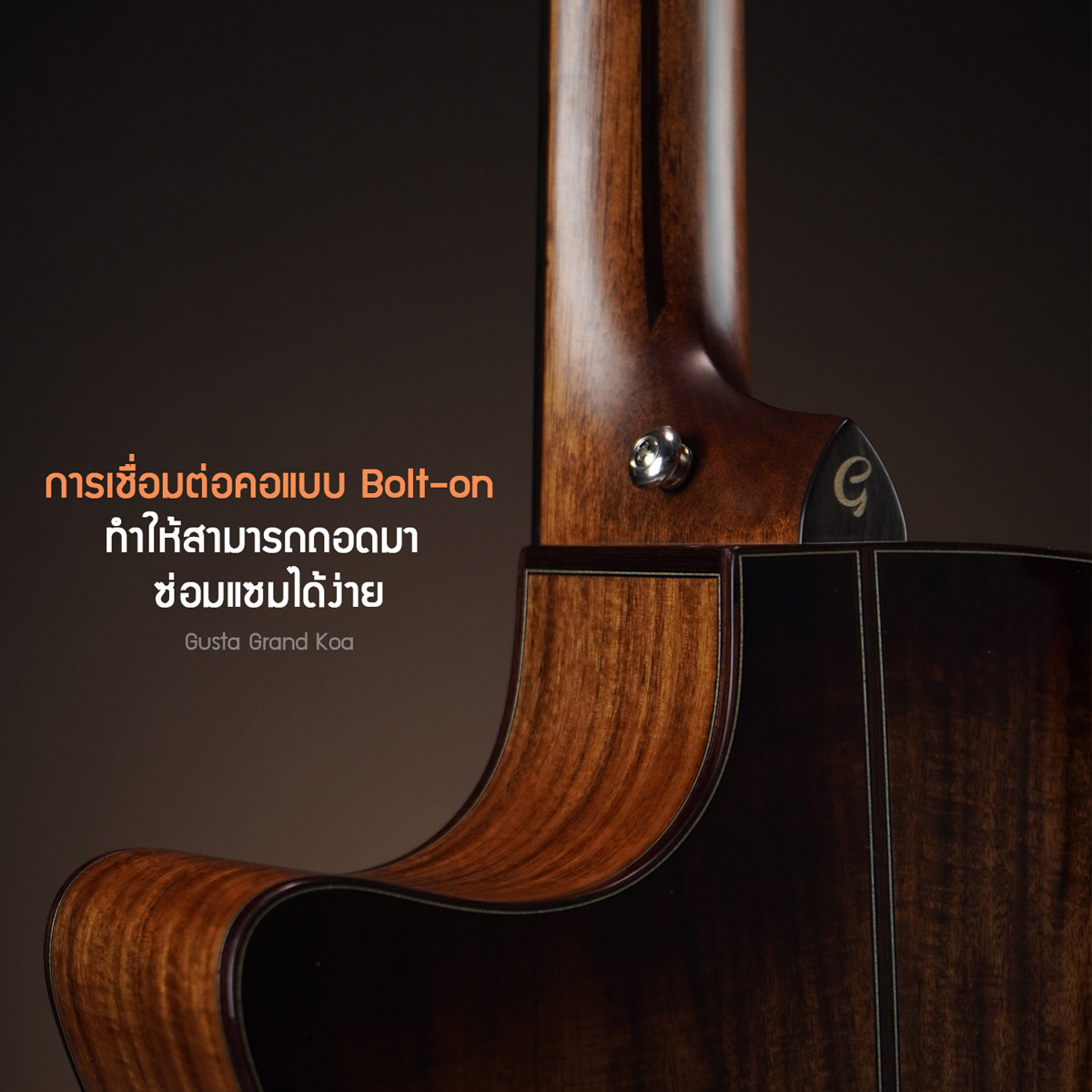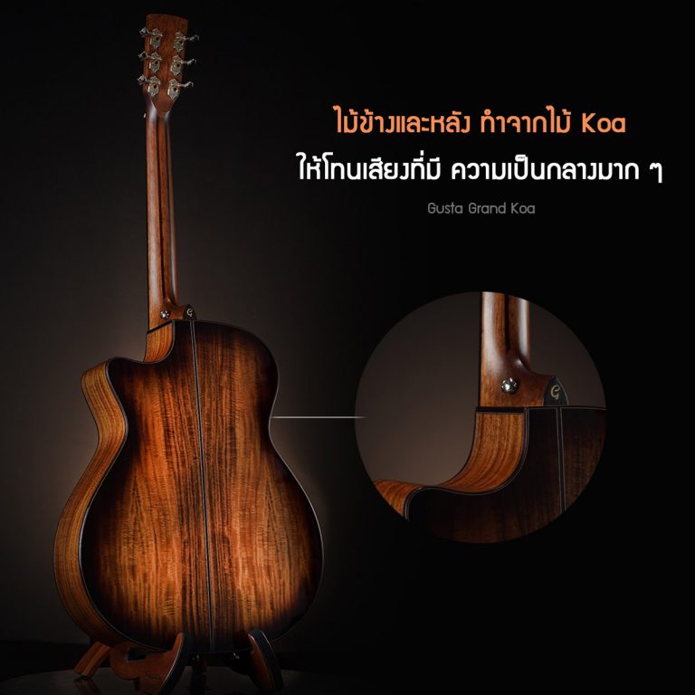 Gusta Grand Koa กีตาร์โปร่งไฟฟ้าที่อัพเกรดความหรูหราอลังการไปอีกขั้นด้วยสเปคที่จัดเต็มกว่าเดิม แน่นอนว่ารุ่นนี้จะเป็นท็อปโซลิดซึ่งเลือกใช้ไม้แอฟริกันมะฮอกกานีที่ให้โทนเสียงหนานุ่มนวล ส่วนด้านข้างและด้านข้างเป็นเสียงใสๆของไม้โคอะซึ่งคัดเกรดไม้เฟรมที่มีลายสวยงามและหายากมาให้อีกด้วย บอดี้เป็นทรงแกรนด์ออดิทอเรียมซึ่งจะมีขนาดที่ไม่ใหญ่มาก แต่ให้พลังเสียงเต็มไม่ว่าจะตีคอร์ดหรือฟิงเกอร์สไตล์ มาพร้อมภาคไฟฟ้าของ Fishman Sonitone เสียงใสออกงานสบาย อะไหล่ส่วนอื่นๆยอดเยี่ยมทุกจุด ลงตัวด้วยไบน์ดิงลายเปลือกหอย เป็นอีกรุ่นที่นักสะสมหรือคนชอบไม้โคอะต้องไม่พลาด