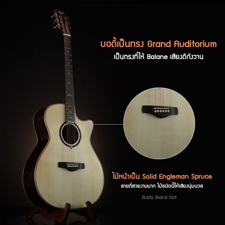 Gusta Grand Slot กีตาร์โปร่งไฟฟ้ากับงานดีไซด์ที่คล้ายกีตาร์คลาสสิก ส่วนเรื่องเสียงยังคงเข้มข้นเพราะได้ไม้หน้าเป็นไม้ท็อปโซลิดแองเกิลแมนสปรูซ ให้ย่านเสียงกลางโดดเด่นและยังเป็นไม้แท้ที่นานไปเสียงจะหวานนุ่มนวลมากขึ้น ด้านข้างและหลังไม้อินเดียนโรสวูดที่ให้โทนเสียงเบาหนา ซาวด์นุ่มมีมิติที่ลงตัว ภาคไฟฟ้ารุ่น Fishman Sonitone คุณภาพเสียงระดับออกงานสบาย ลงตัวในทุกจุดกับงานดีไซด์ที่ปราณีต อะไหล่เกรดเยี่ยมอย่างหัวกีตาร์ไม้โรสวูด หรือนัทและ Saddle ทำจากกระดูก ถ้าชอบสไตล์คลาสสิกอยากได้งานคุณภาพ รุ่นนี้ตอบโจทย์แน่นอน